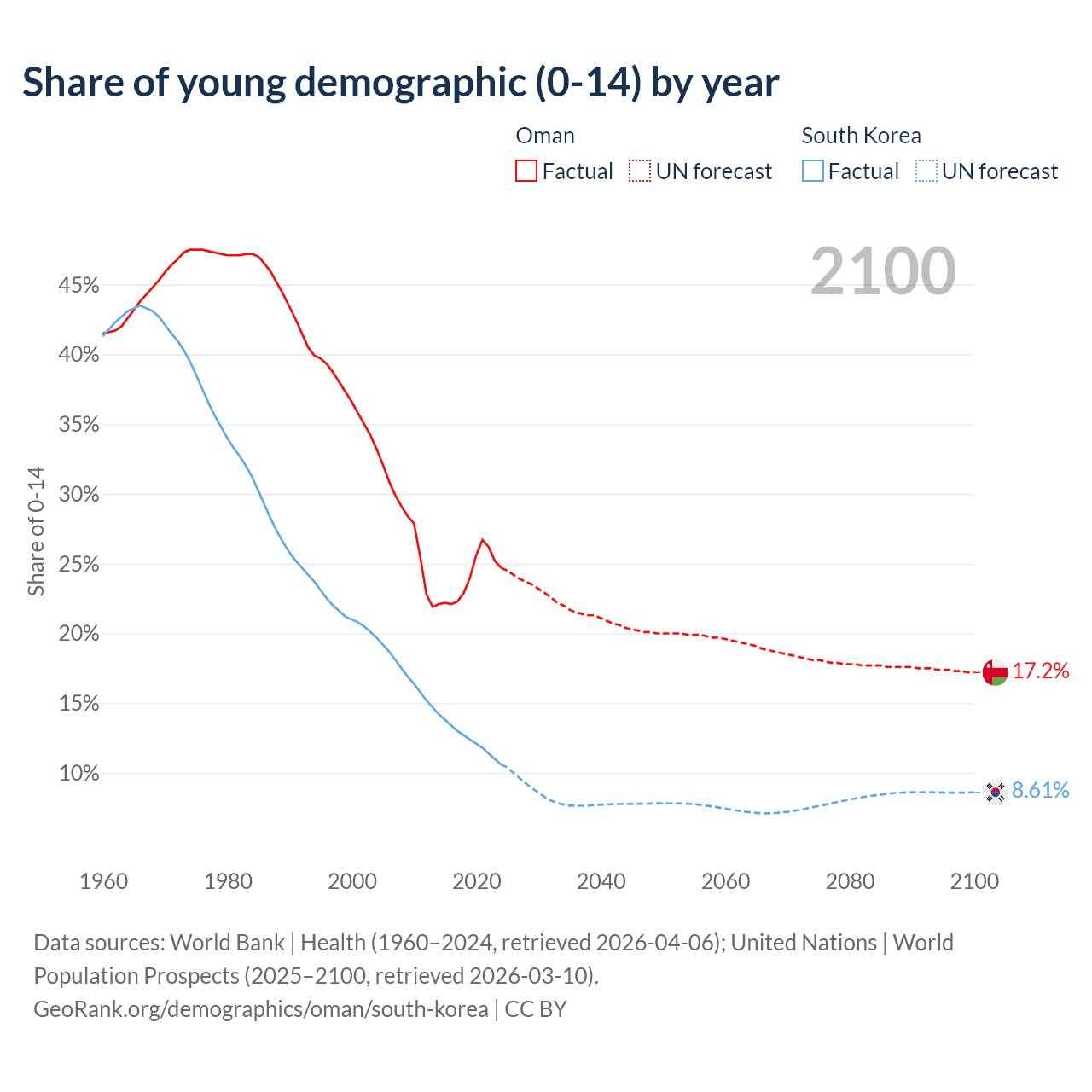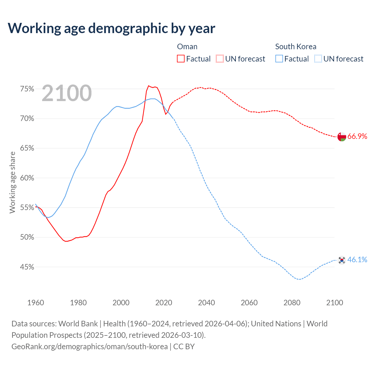 Median age Oman vs South Korea, 1960-2100