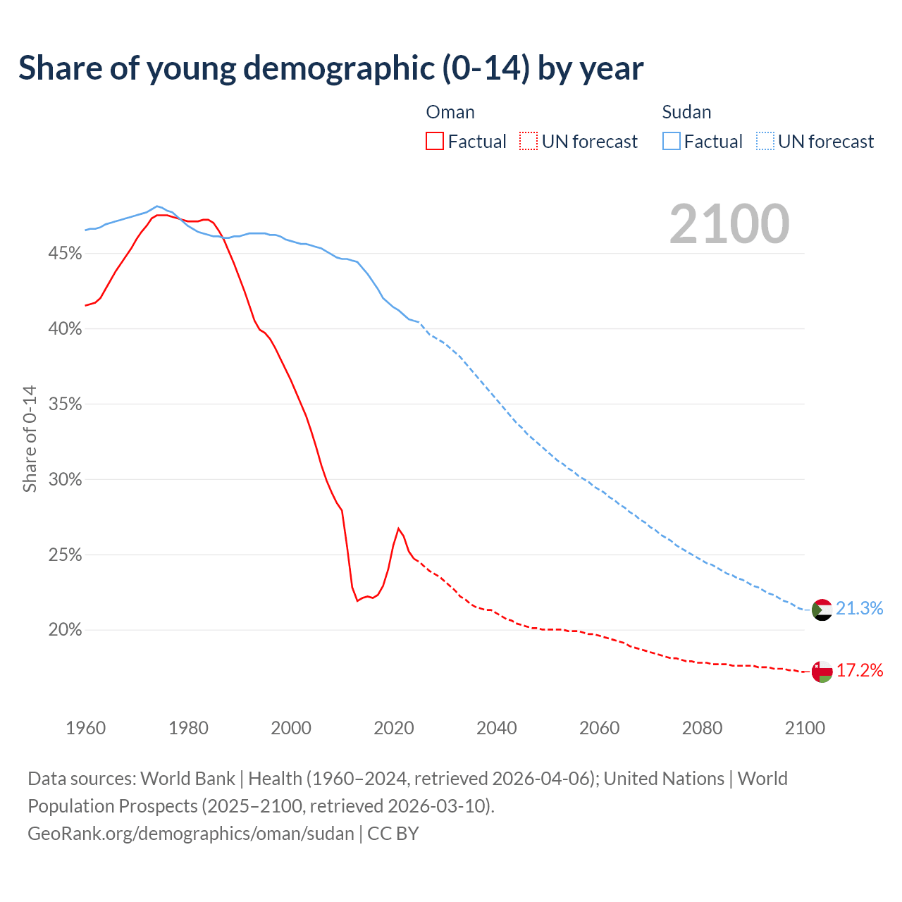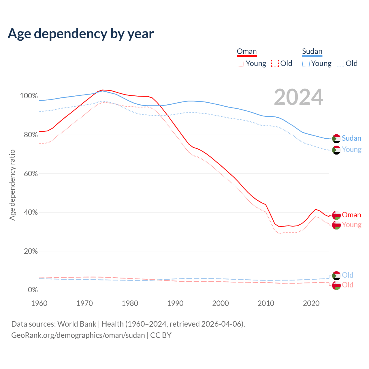 - Oman is ranked 101/196 by median age (oldest to youngest) vs 172/196 for Sudan.