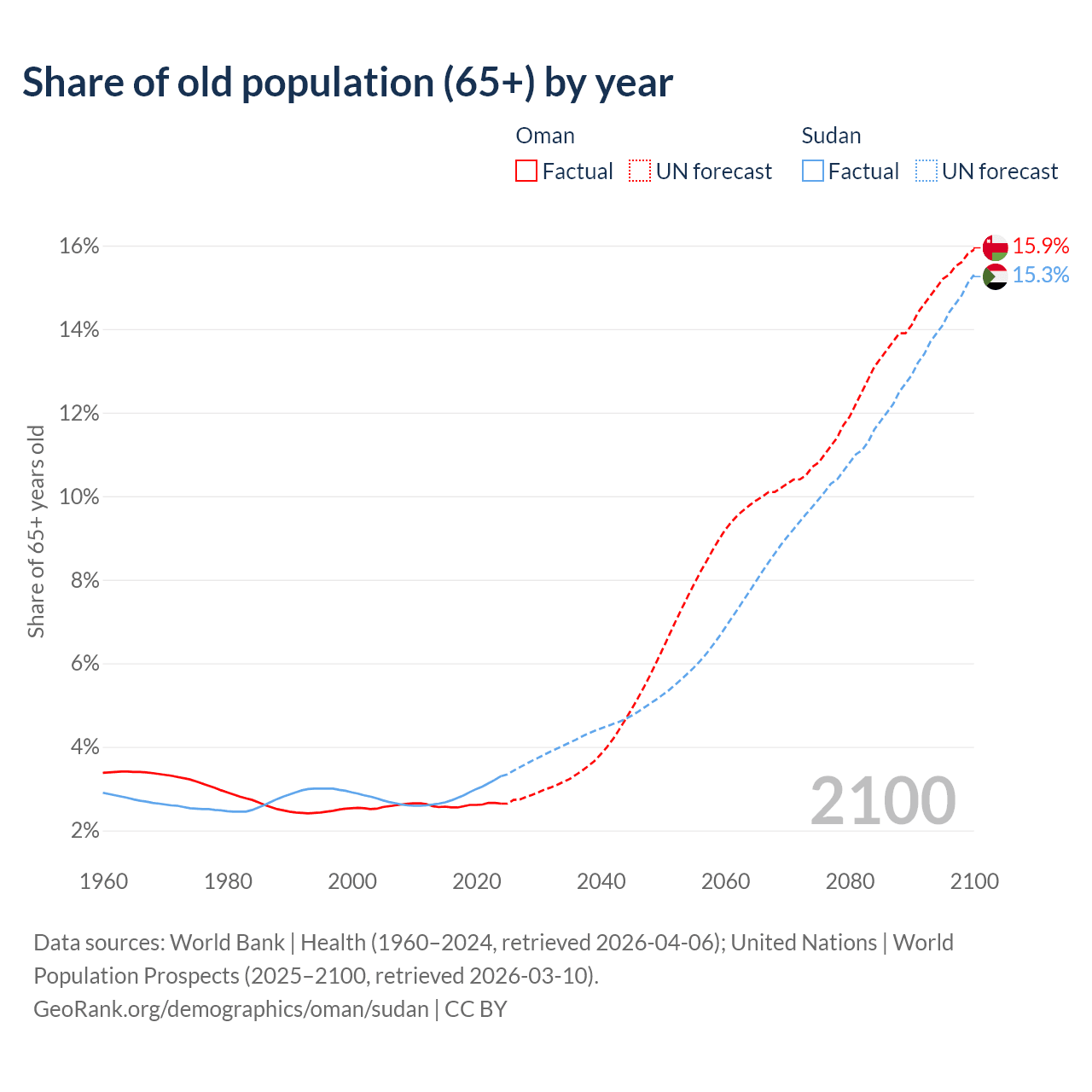 The share of older people aged 65 and over is 2.64% in Oman and 3.3% in Sudan. Life expectancy in Oman compared to Sudan .