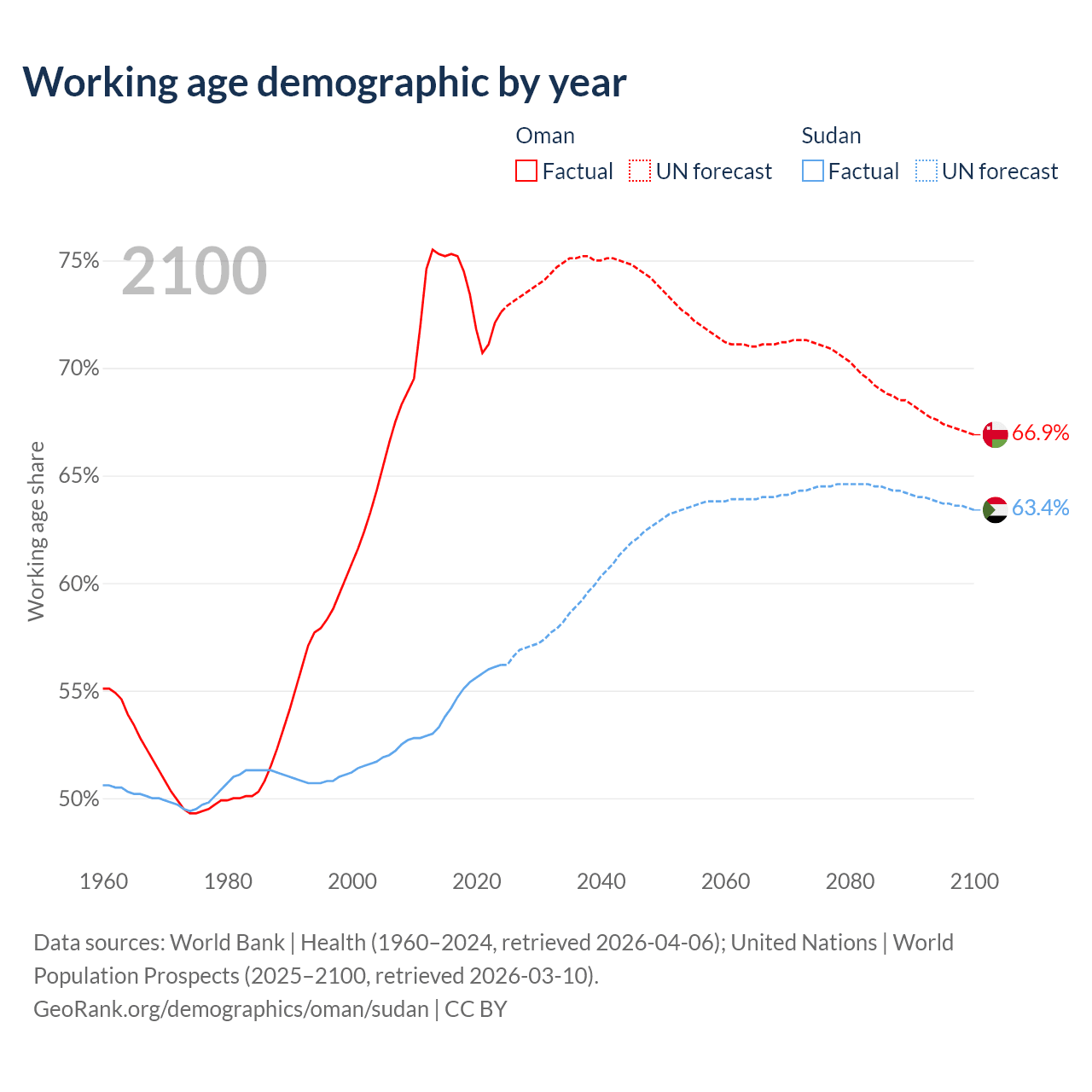 - Oman has 4.19M working age adults (aged 15-64) vs 30M in Sudan.
