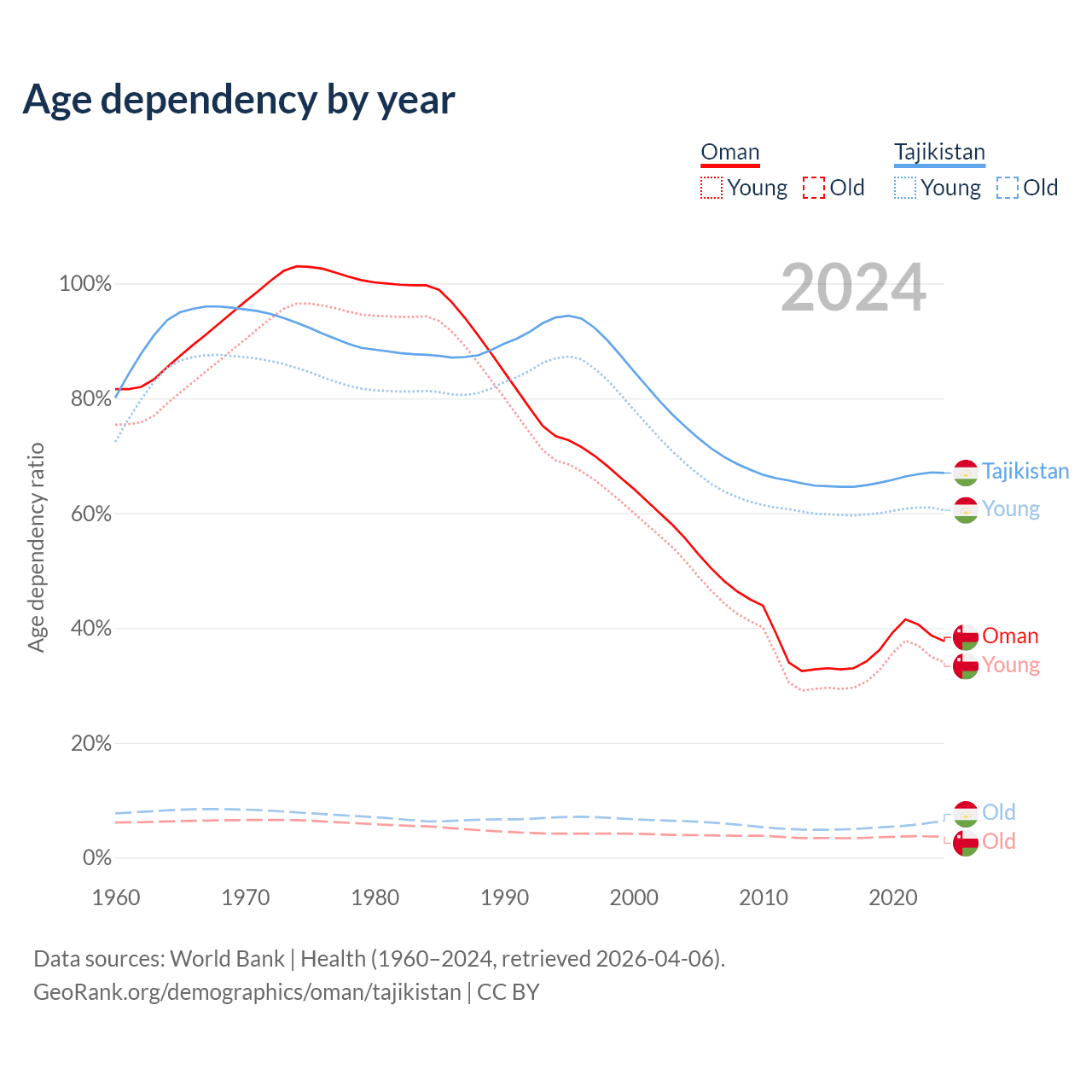 - The share of old-age demographic (65+) in Oman is 2.64% vs 3.85% in Tajikistan.