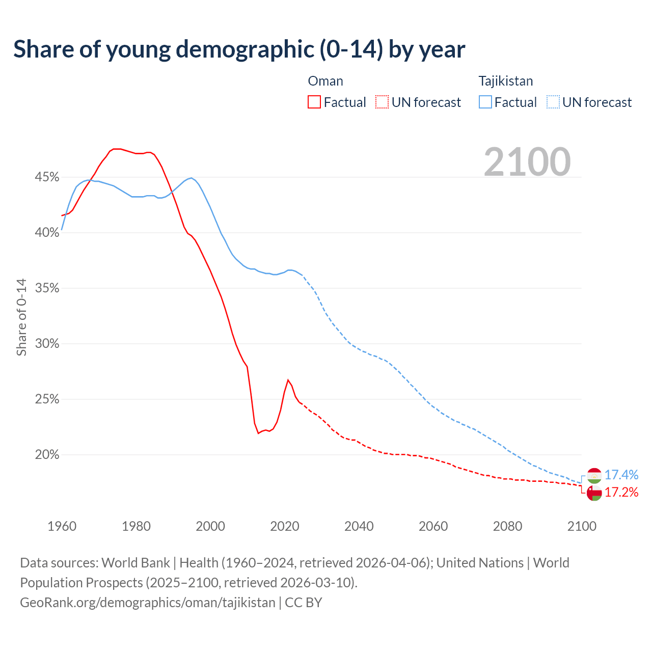 - The share of young demographic (0-15 years old) in Oman is 24.7% vs 36.3% in Tajikistan.