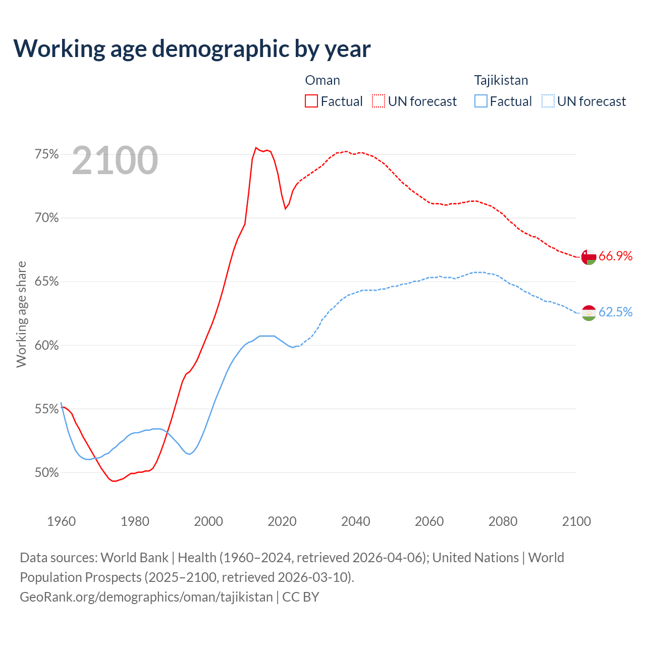 - Oman has 4.19M working age adults (aged 15-64) vs 6.61M in Tajikistan.