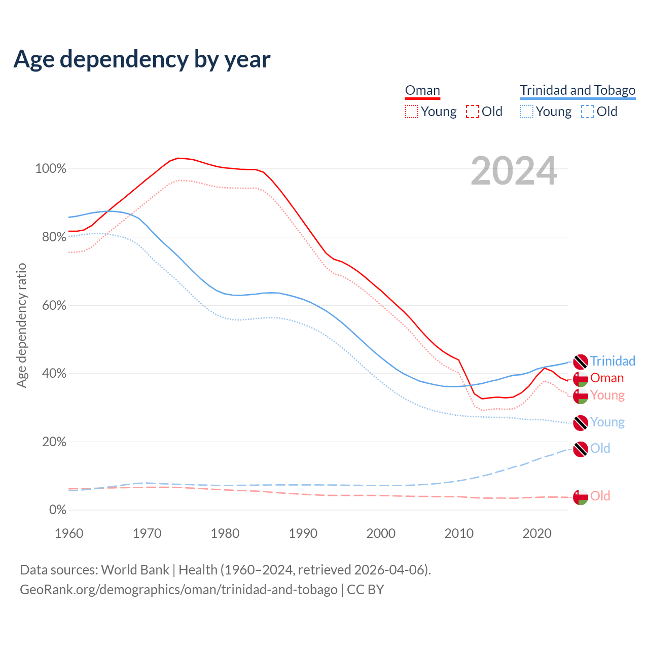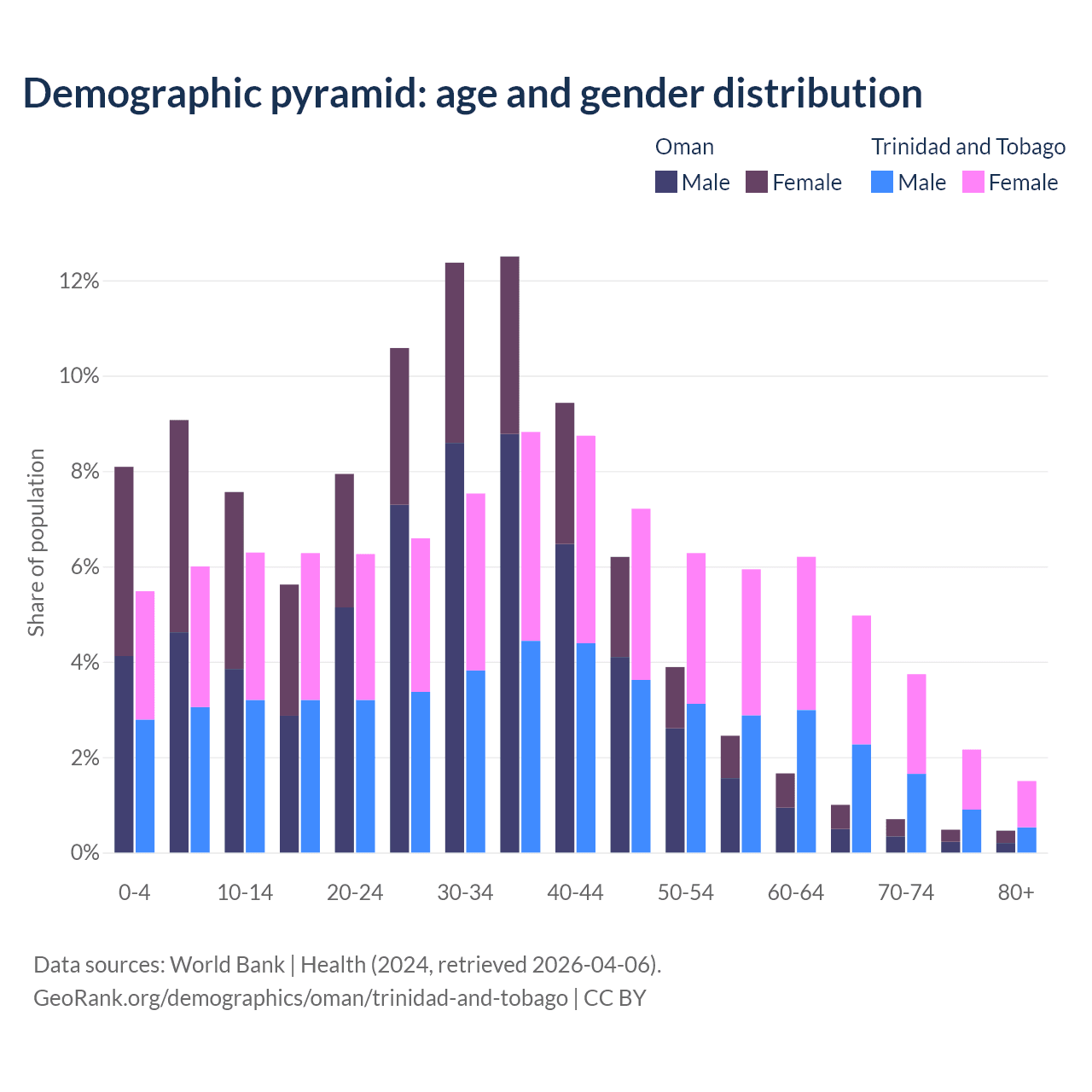 - Oman is ranked 101/196 by median age (oldest to youngest) vs 58/196 for Trinidad and Tobago.