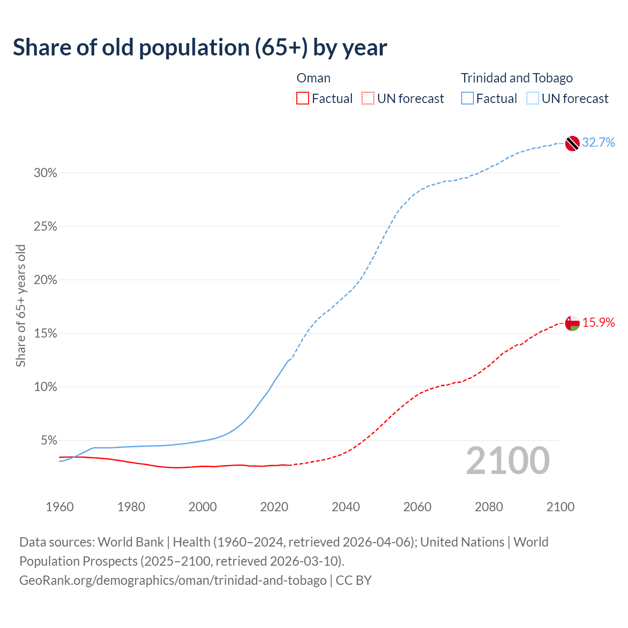 The share of older people aged 65 and over is 2.64% in Oman and 12.4% in Trinidad and Tobago. Life expectancy in Oman compared to Trinidad and Tobago .