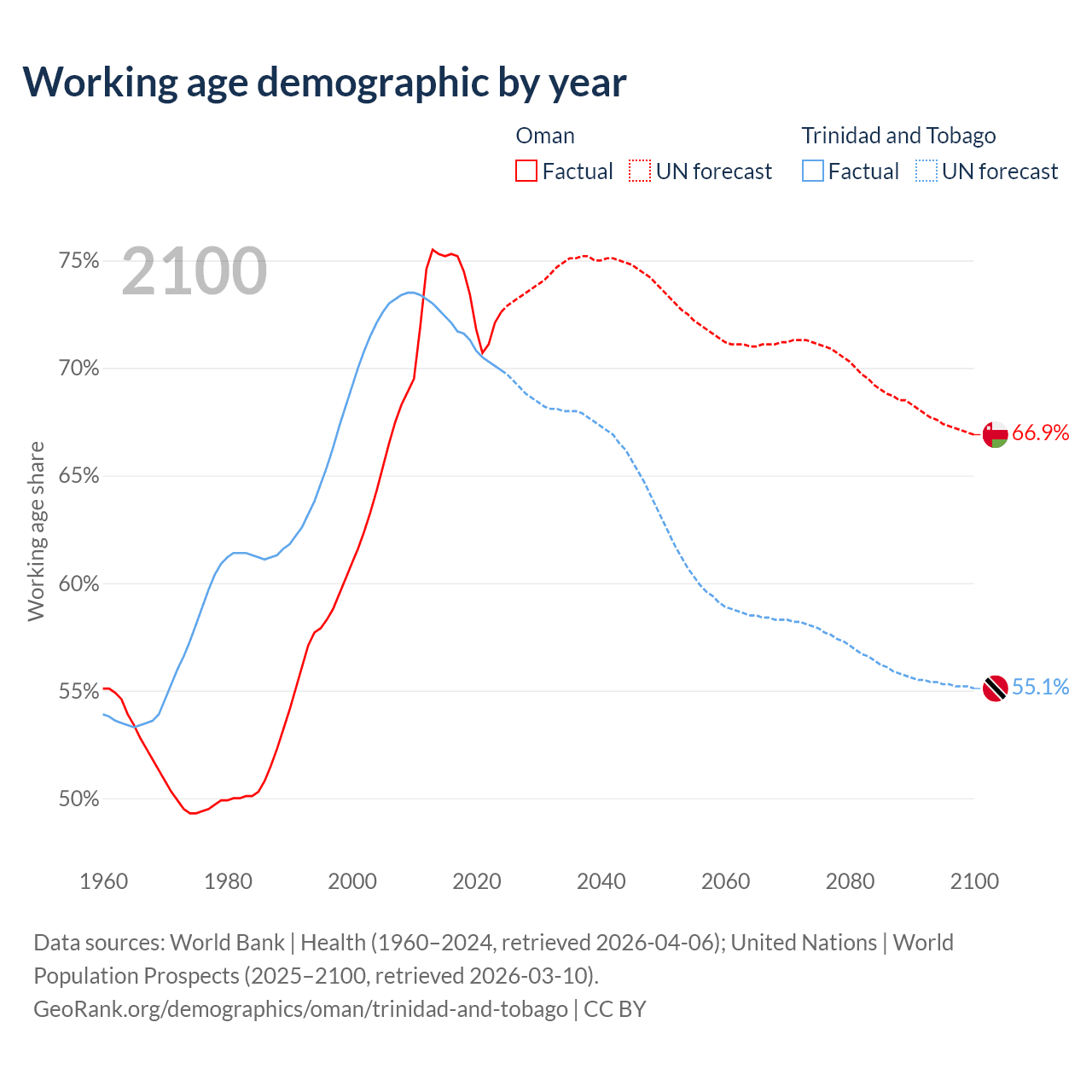 - Oman has 4.19M working age adults (aged 15-64) vs 960K in Trinidad and Tobago.