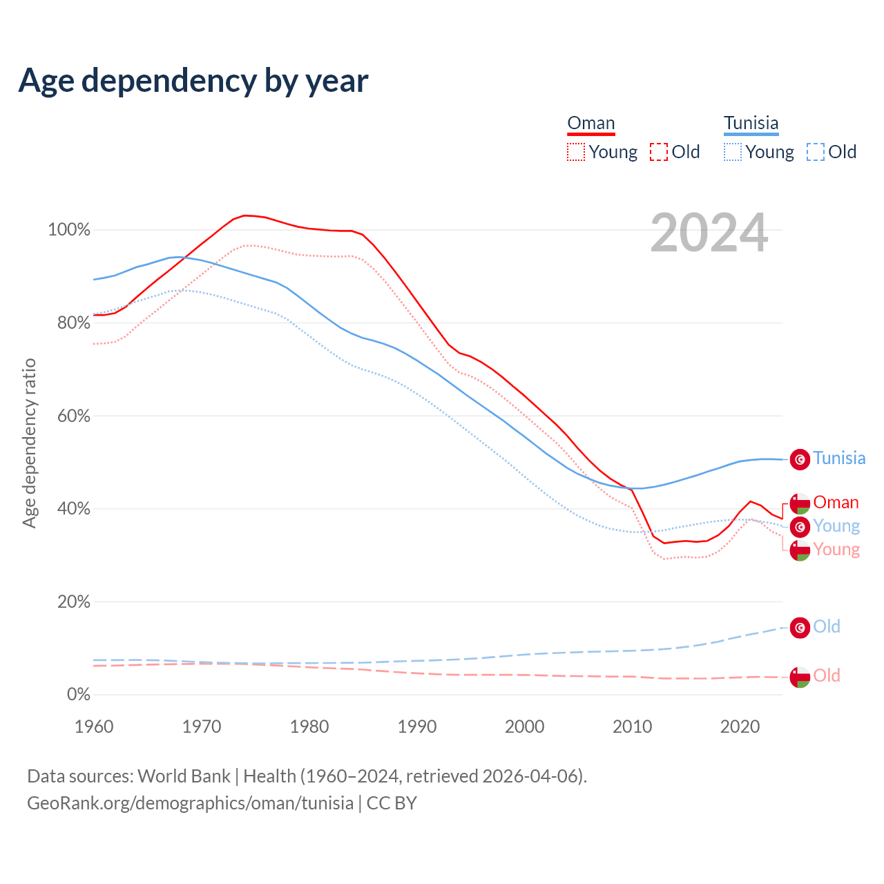 - Oman is ranked 101/196 by median age (oldest to youngest) vs 86/196 for Tunisia.