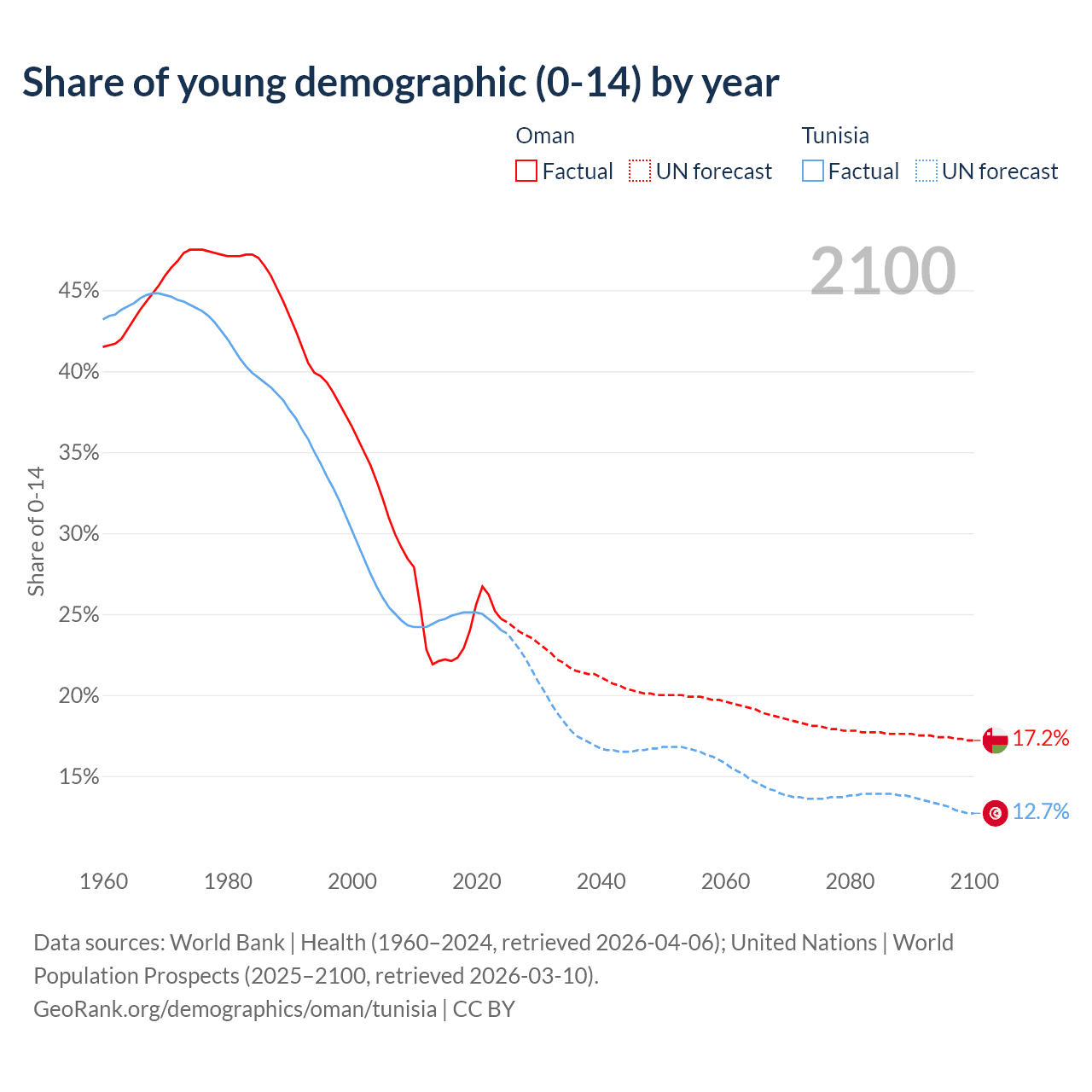 - The share of young demographic (0-15 years old) in Oman is 24.7% vs 24% in Tunisia.