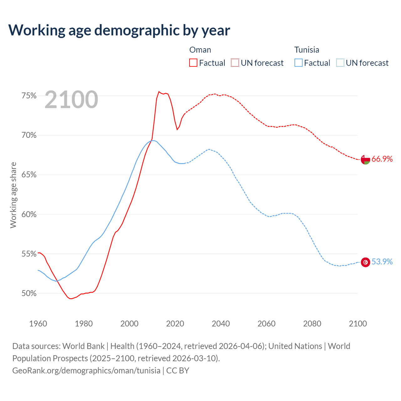 - Oman has 4.19M working age adults (aged 15-64) vs 8.26M in Tunisia.