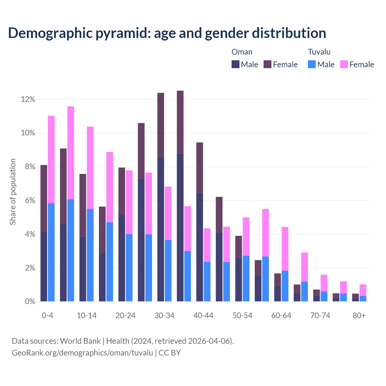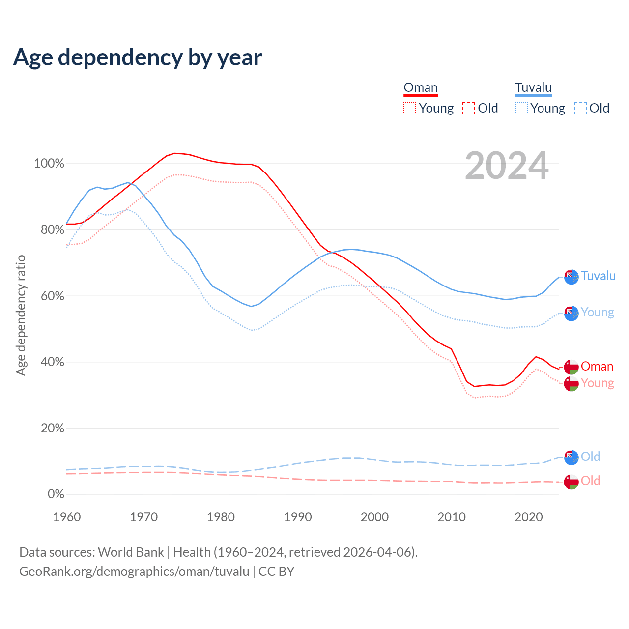 - Oman is ranked 101/196 by median age (oldest to youngest) vs 132/196 for Tuvalu.