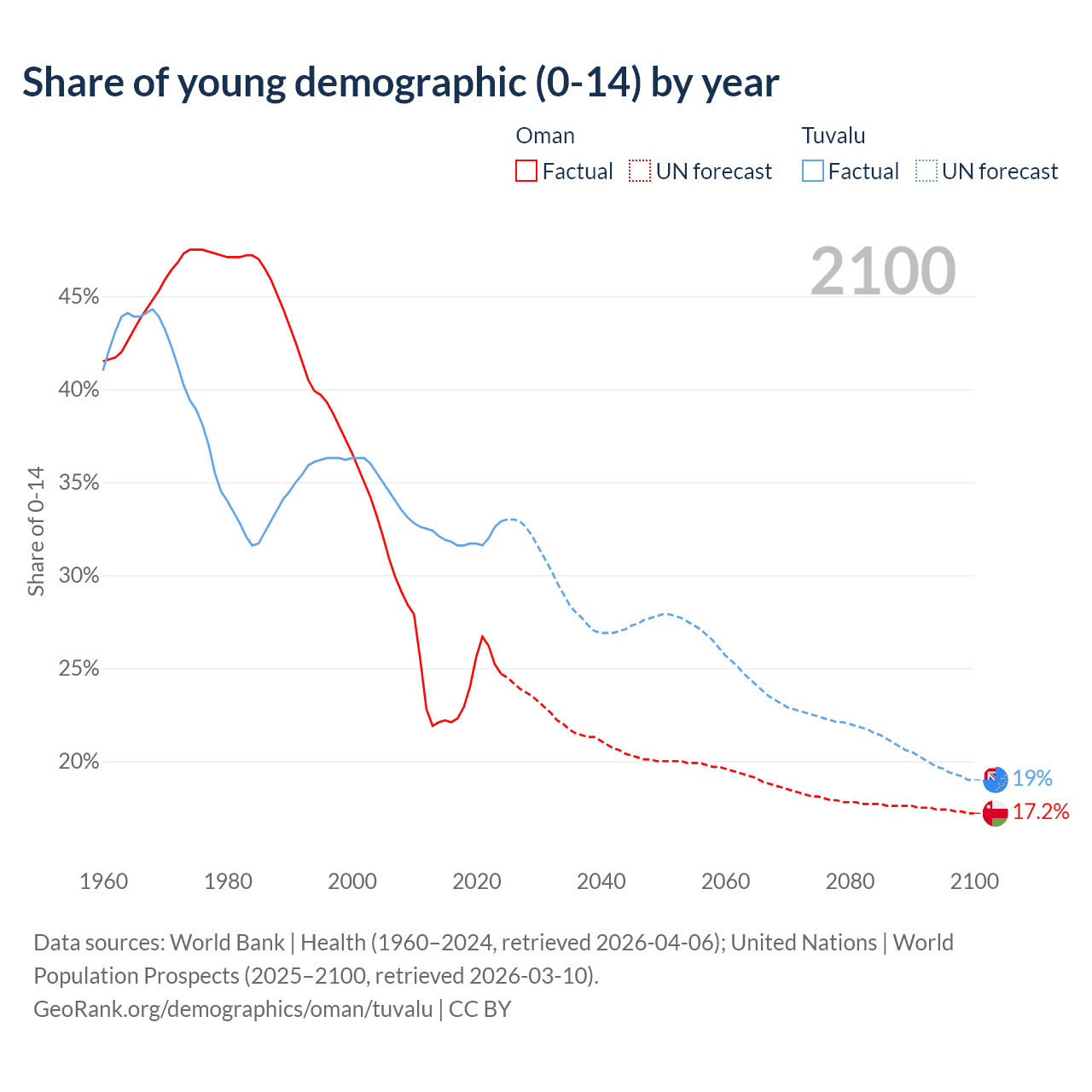 - The share of young demographic (0-15 years old) in Oman is 24.7% vs 32.9% in Tuvalu.