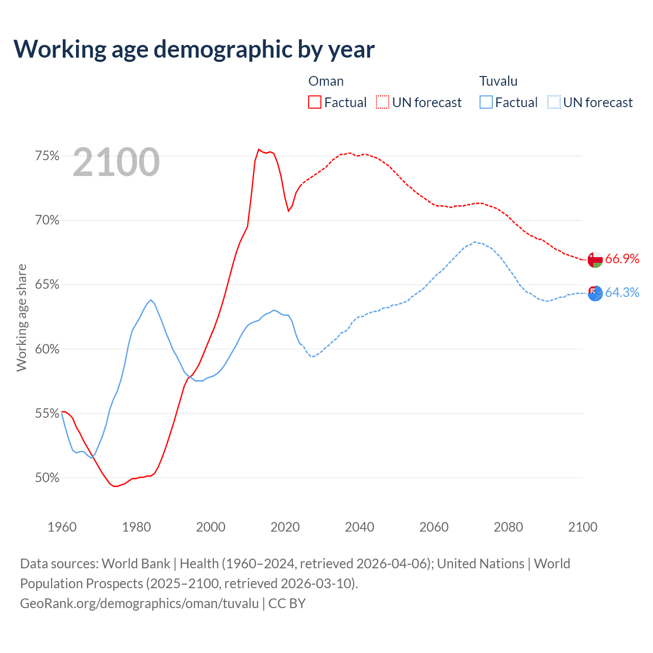 - Oman has 4.19M working age adults (aged 15-64) vs 5.64K in Tuvalu.