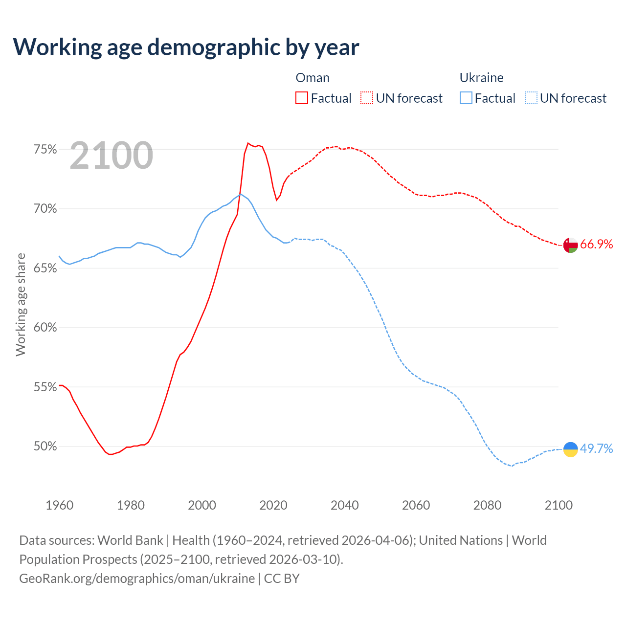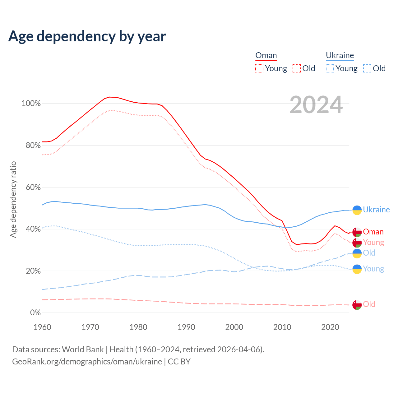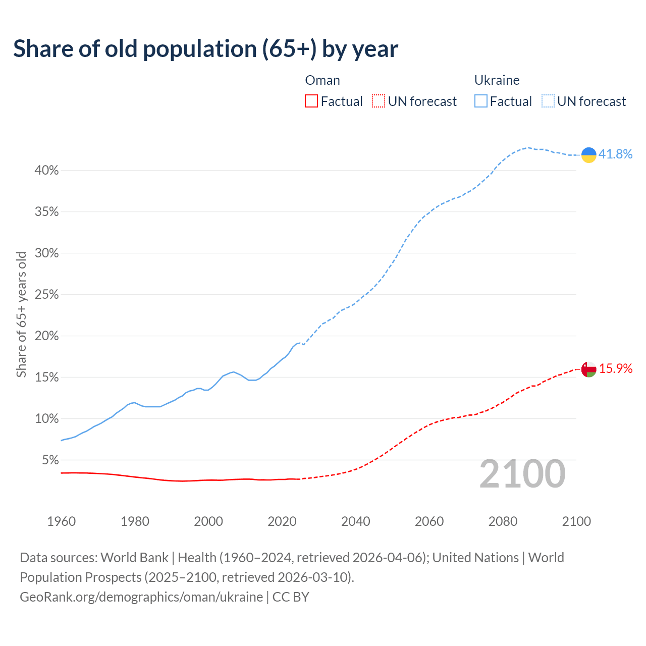 The share of older people aged 65 and over is 2.64% in Oman and 19% in Ukraine. Life expectancy in Oman compared to Ukraine .
