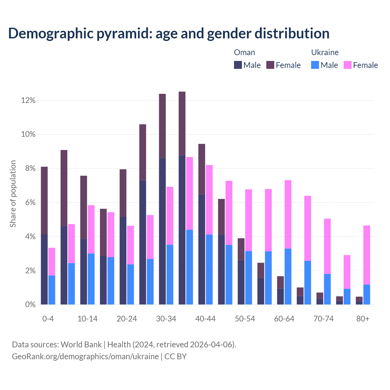- Oman is ranked 101/196 by median age (oldest to youngest) vs 26/196 for Ukraine.