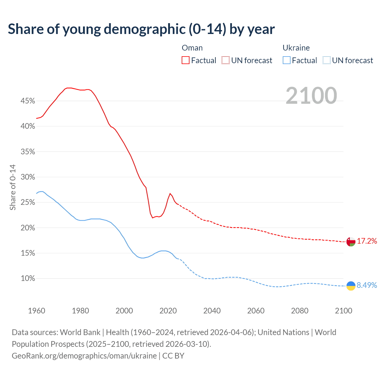 - The share of young demographic (0-15 years old) in Oman is 24.7% vs 13.9% in Ukraine.