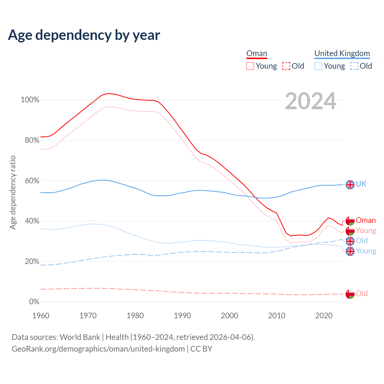 The share of older people aged 65 and over is 2.64% in Oman and 19.5% in the United Kingdom. Life expectancy in Oman compared to the United Kingdom .