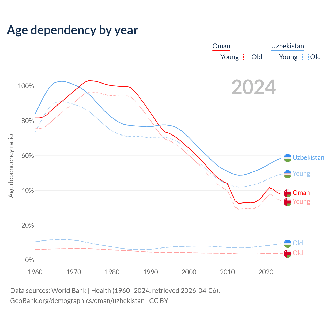 Data sources: World Bank | Health (1960–2024, retrieved 2026-04-06); U.S. Census Bureau (1960–2024, retrieved 2026-02-08).