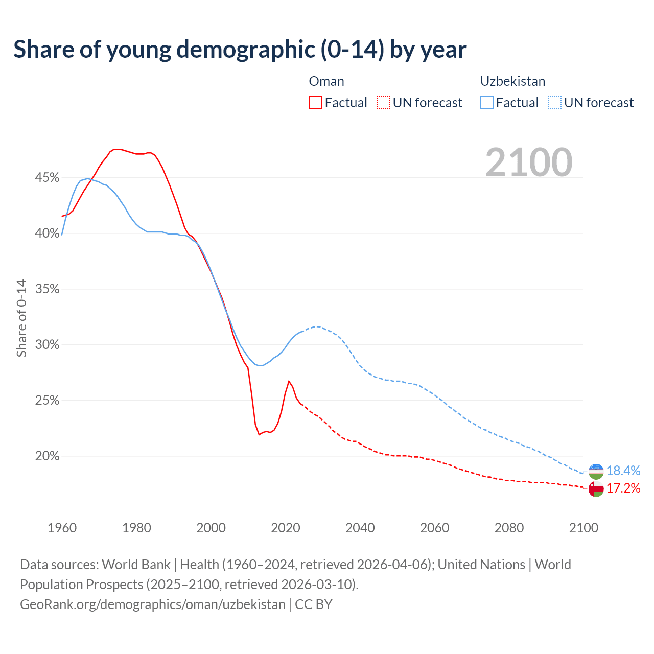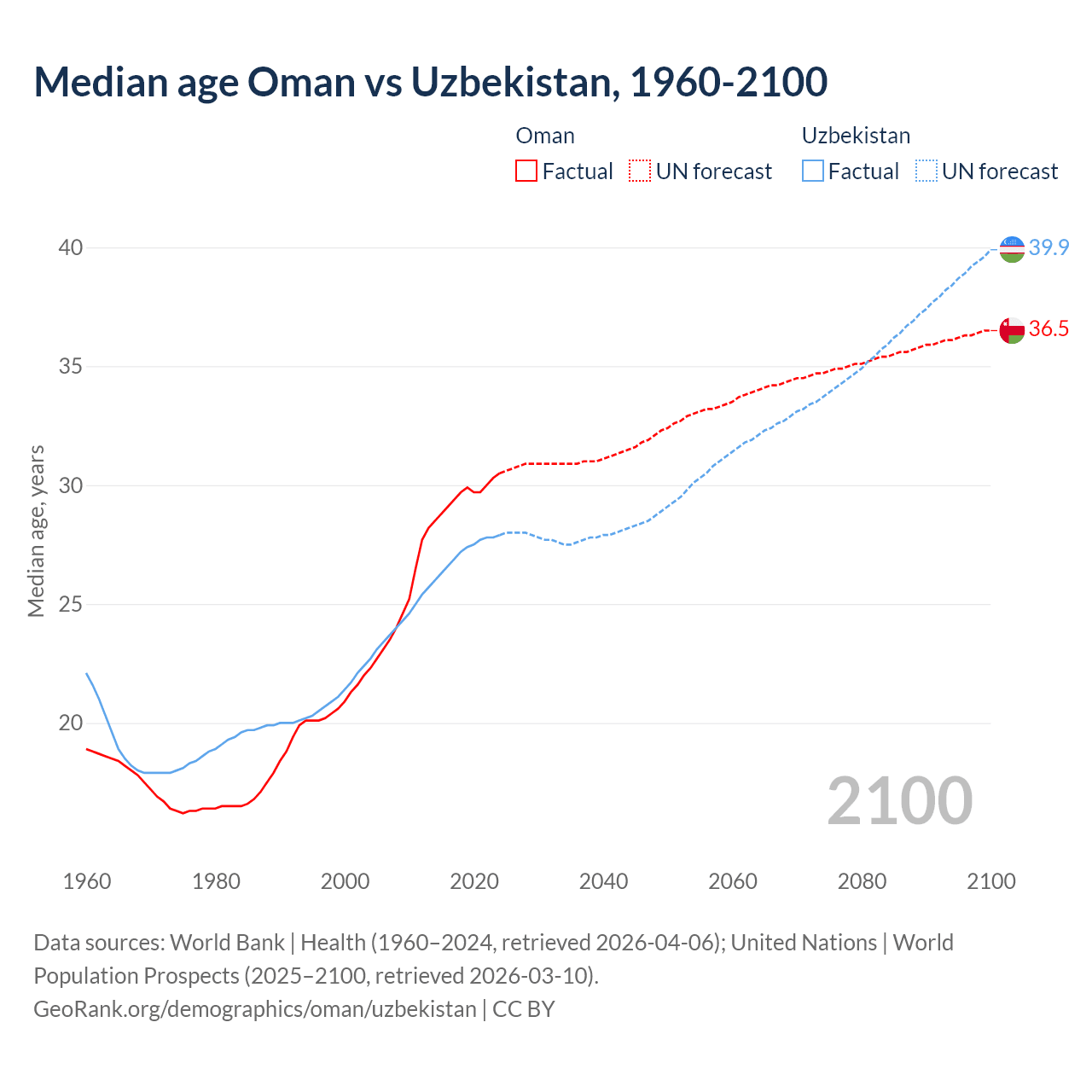 Median age Oman vs Uzbekistan, 1960-2100