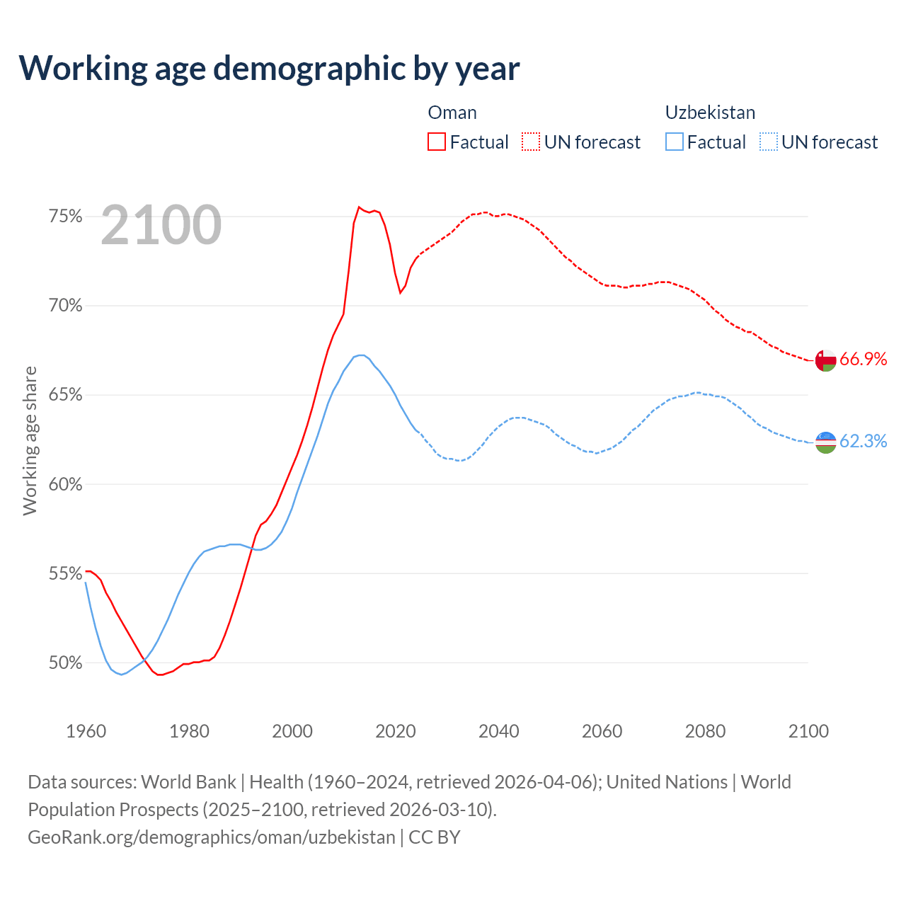 The share of older people aged 65 and over is 2.64% in Oman and 5.86% in Uzbekistan. Life expectancy in Oman compared to Uzbekistan .