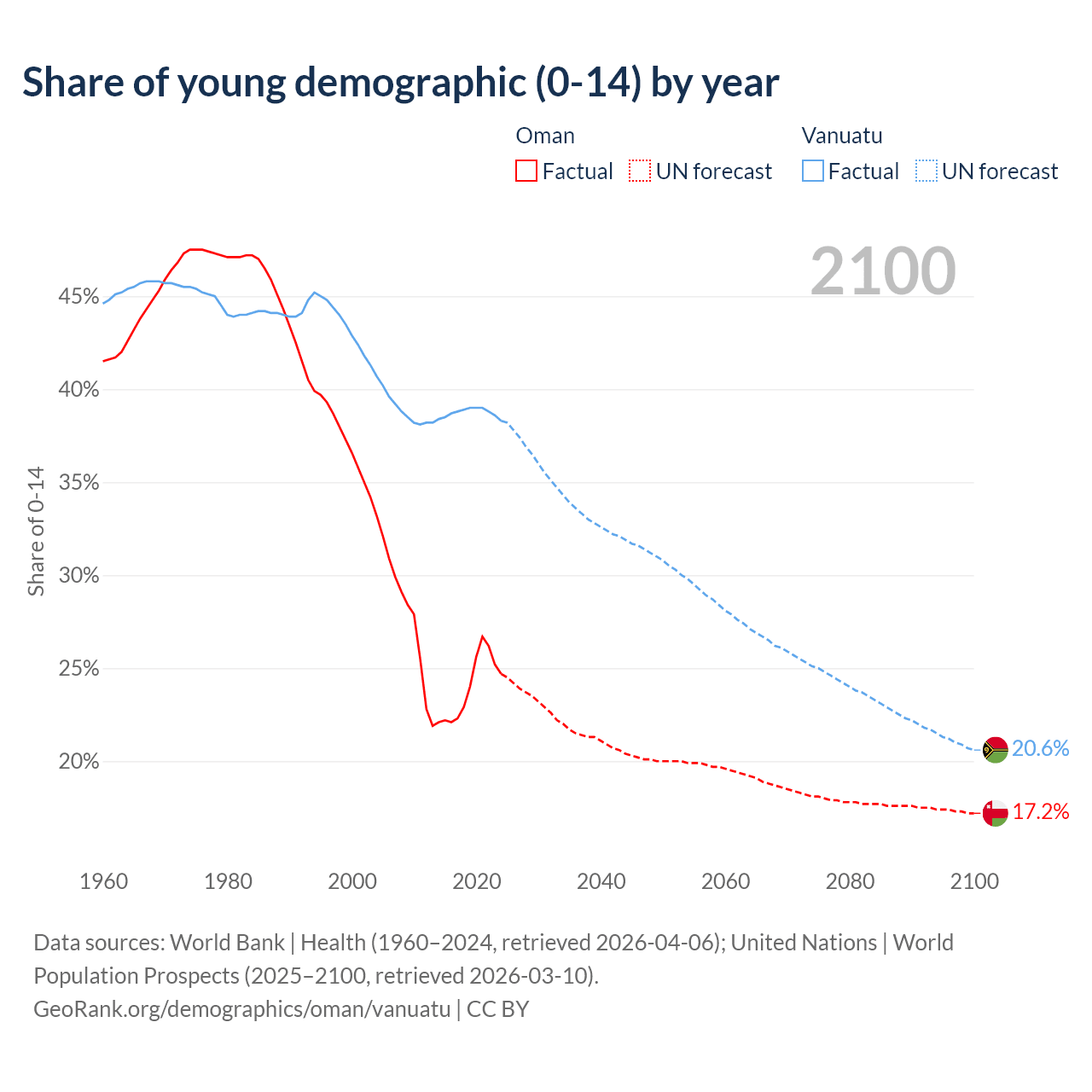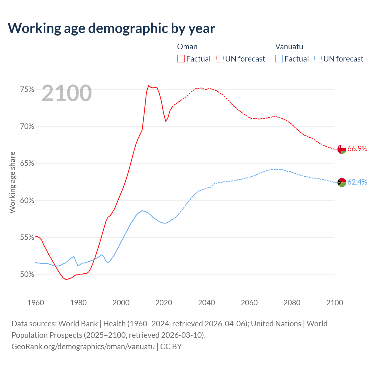 The share of older people aged 65 and over is 2.64% in Oman and 4.3% in Vanuatu. Life expectancy in Oman compared to Vanuatu .