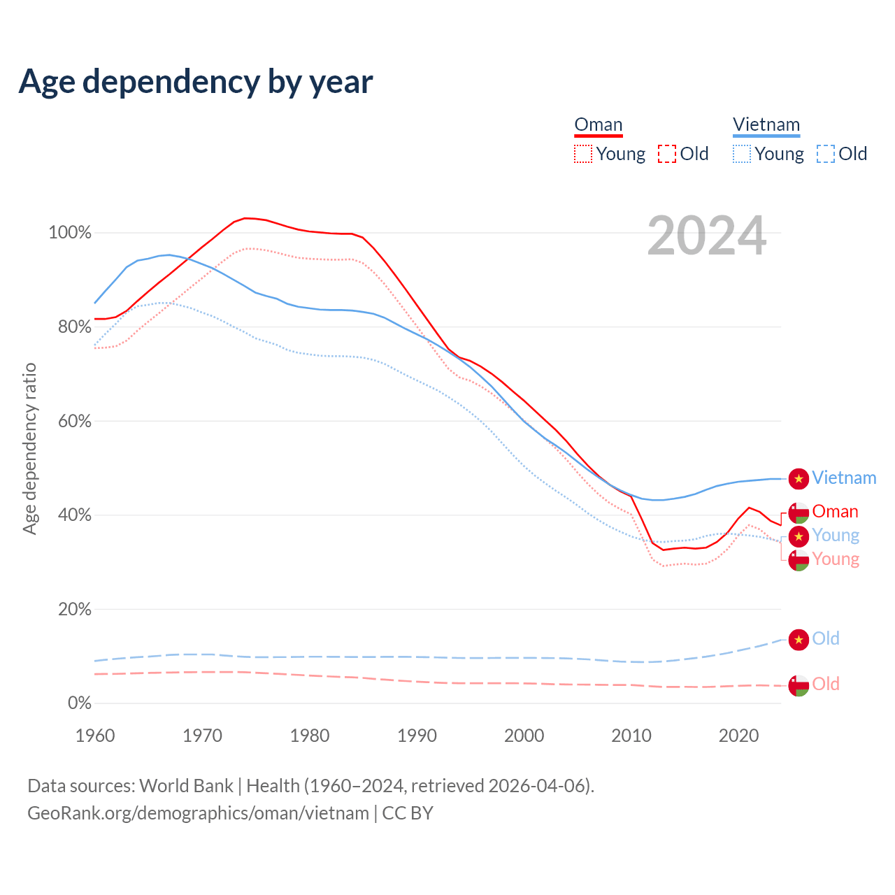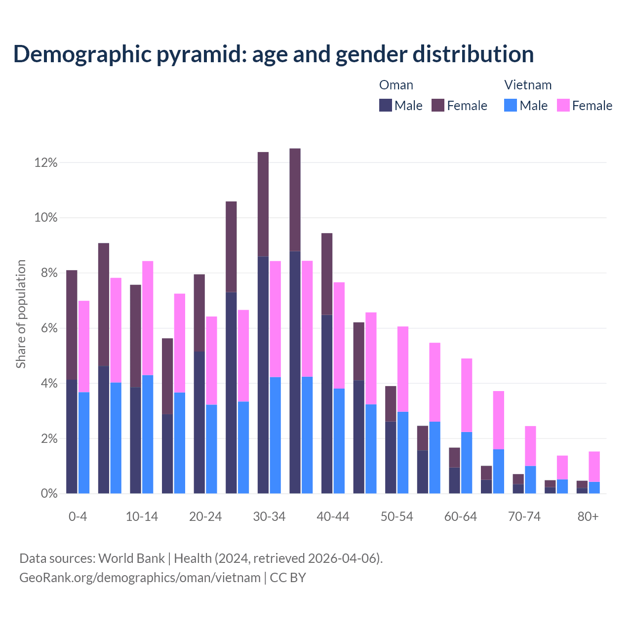 - Oman is ranked 101/196 by median age (oldest to youngest) vs 84/196 for Vietnam.