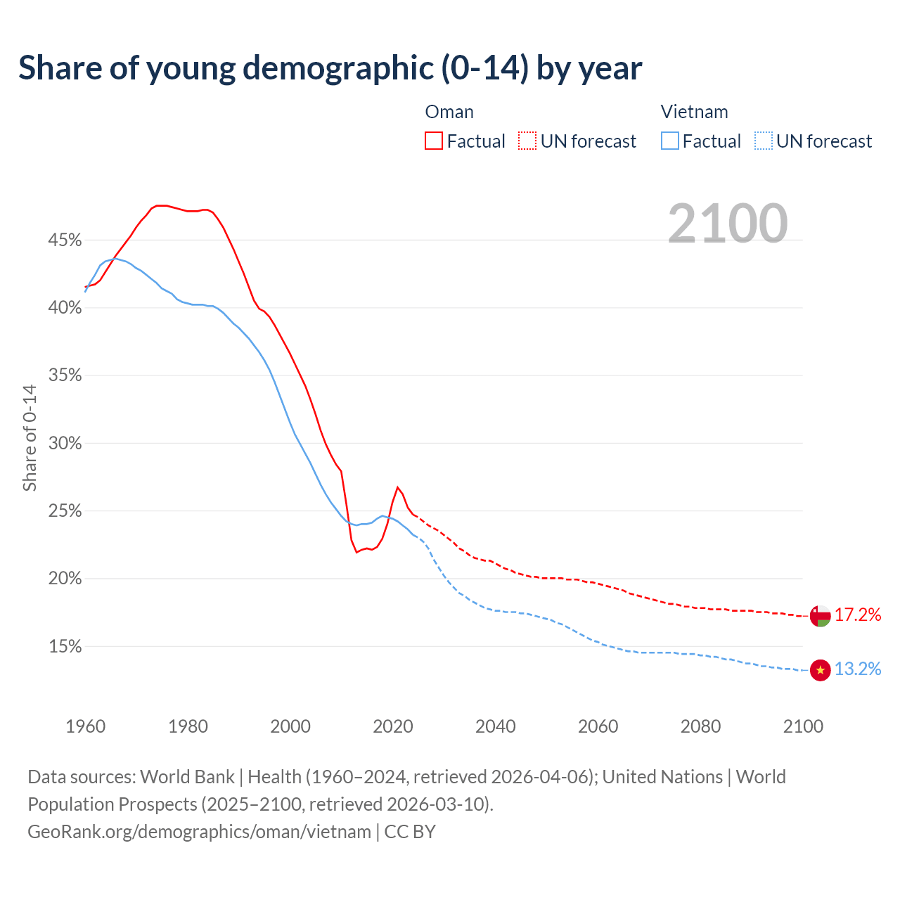 - As of 2026, the population of Oman is 5.76M vs 102M in Vietnam - 17.8 times difference.