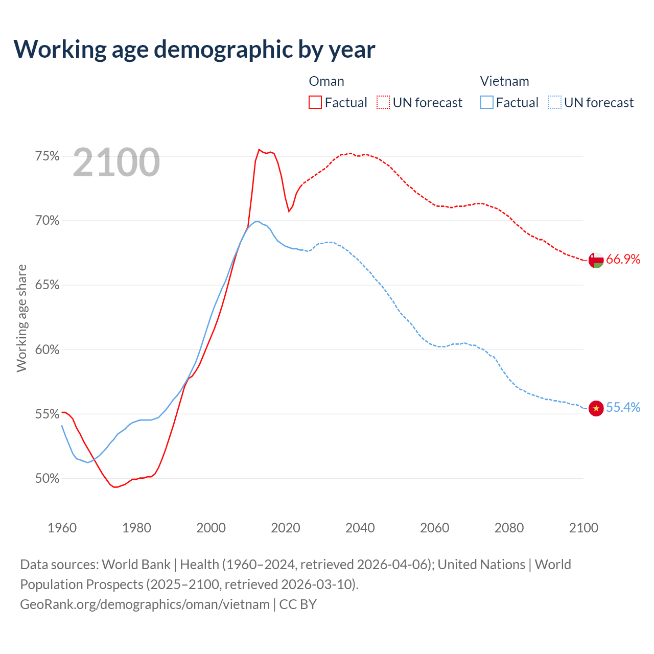 - Oman has 4.19M working age adults (aged 15-64) vs 69.3M in Vietnam.