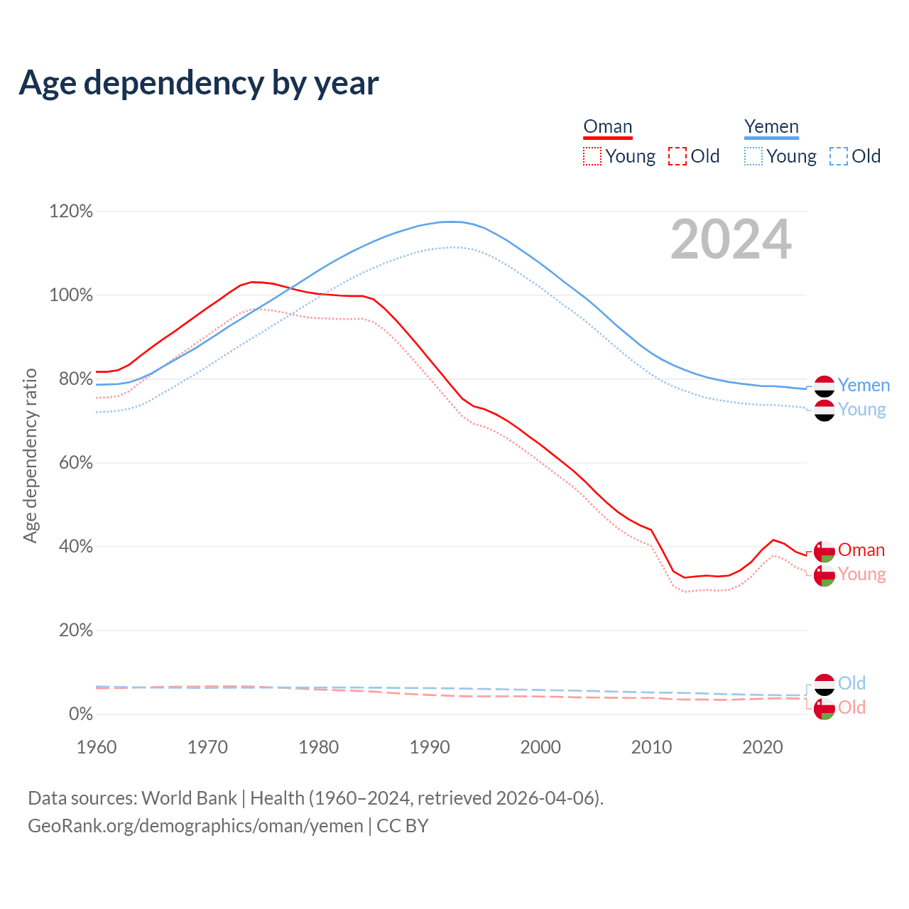 - The share of old-age demographic (65+) in Oman is 2.64% vs 2.52% in Yemen.