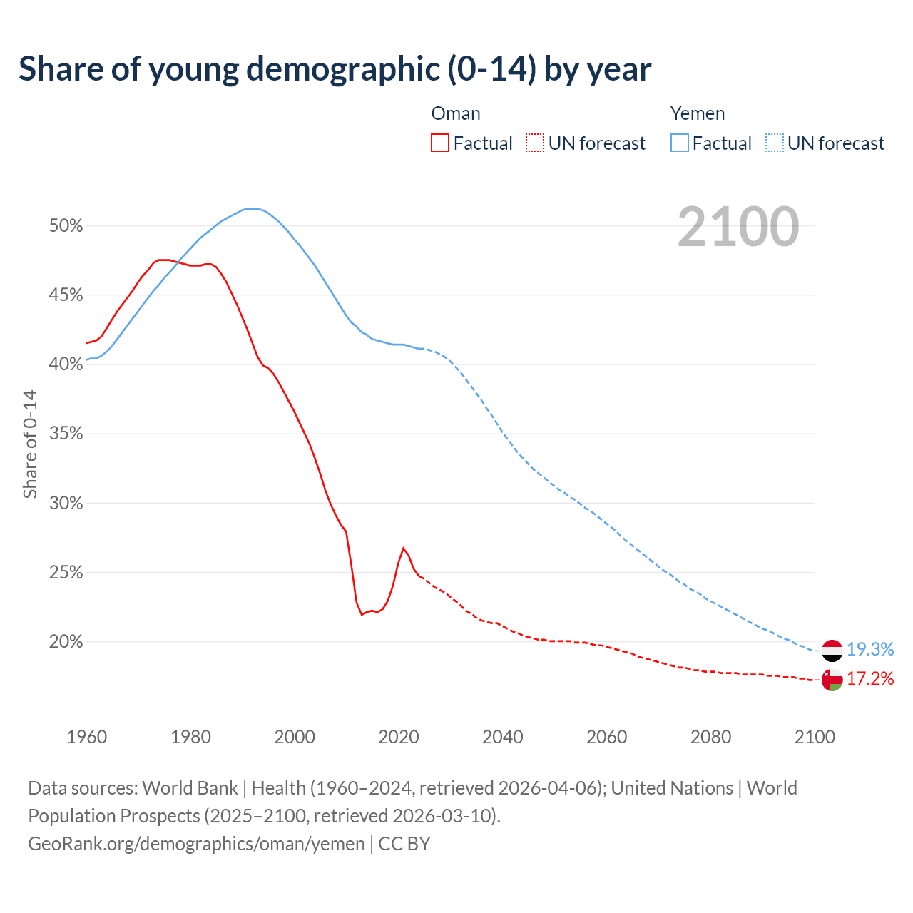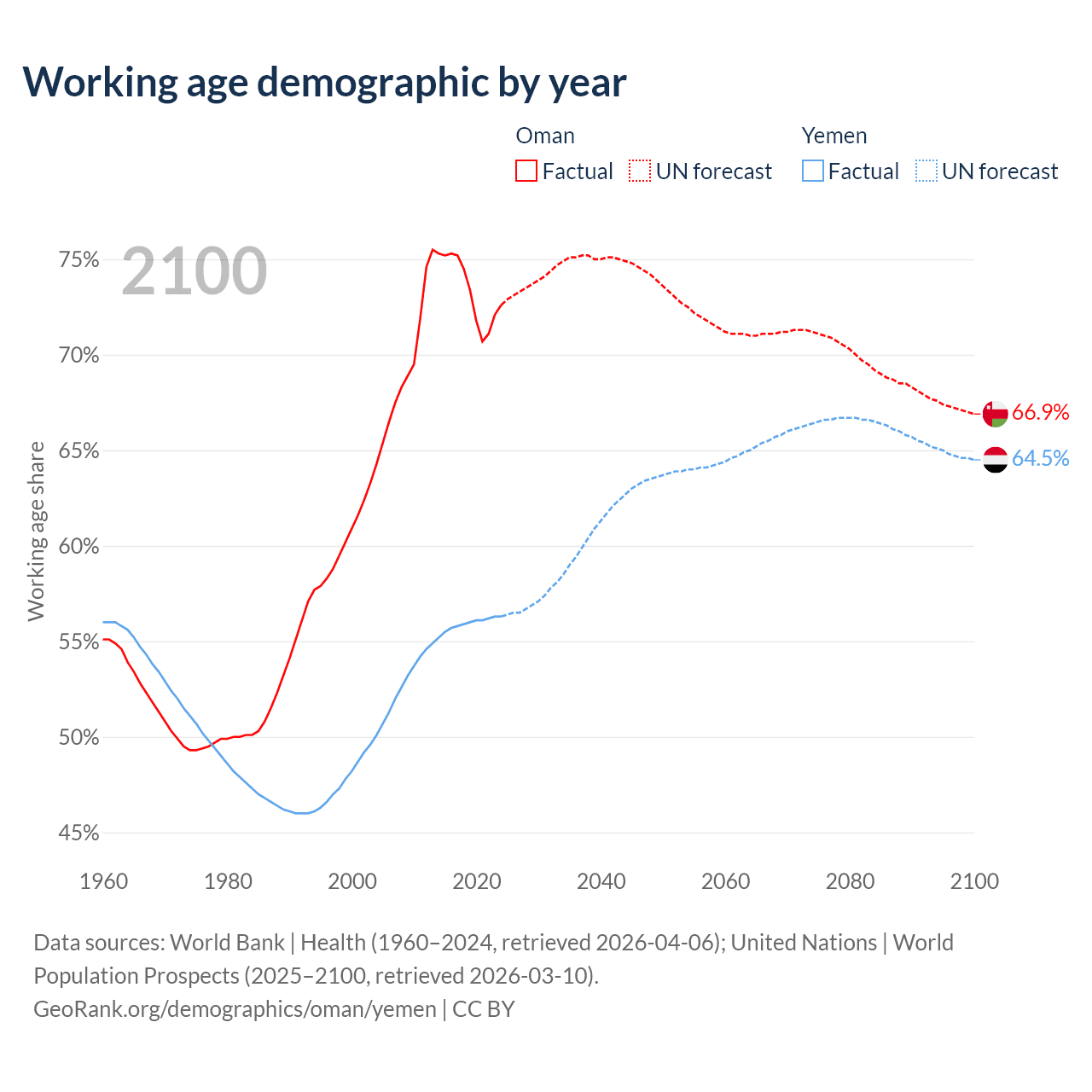 The share of older people aged 65 and over is 2.64% in Oman and 2.52% in Yemen. Life expectancy in Oman compared to Yemen .