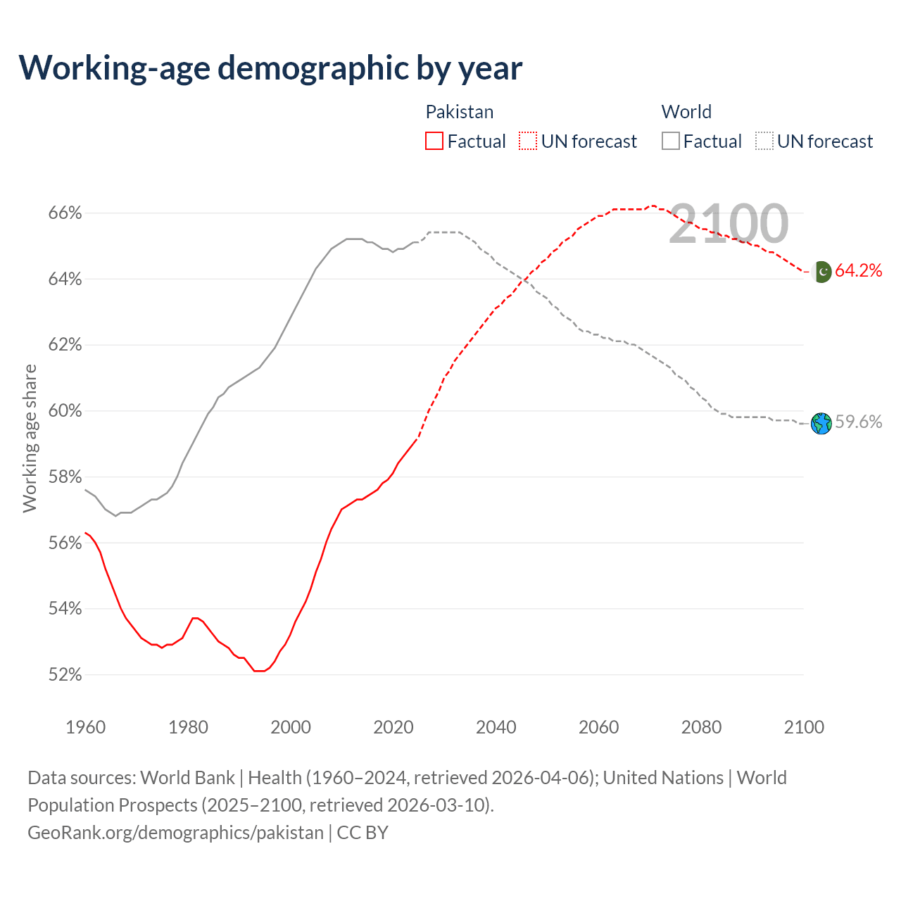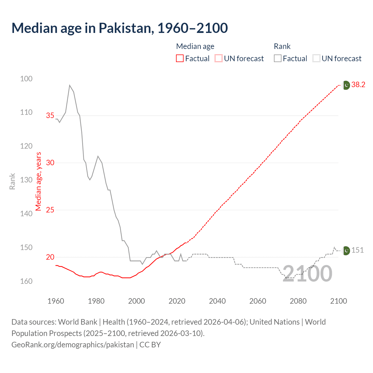 With a population of 251M people, Pakistan has a median age of 21.5 years which makes it the 154/196 oldest country. 36.7% of the demographic are children 0-14 years old, 59% are working-age people aged 15-64, and 4.28% are older population aged 65+ years.