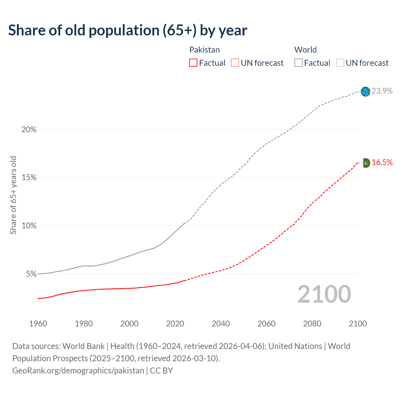 The share of older people aged 65 and over in Pakistan increased from 3.54% to 4.28% between 2004 and 2024.