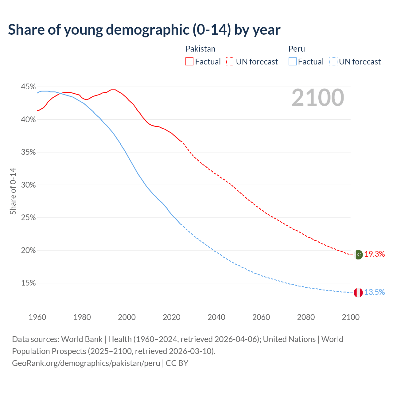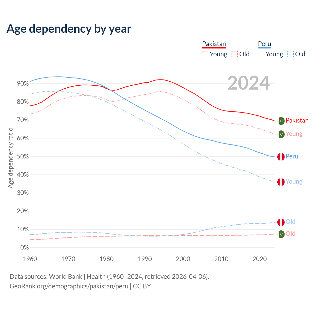 - Pakistan is ranked 154/196 by median age (oldest to youngest) vs 97/196 for Peru.