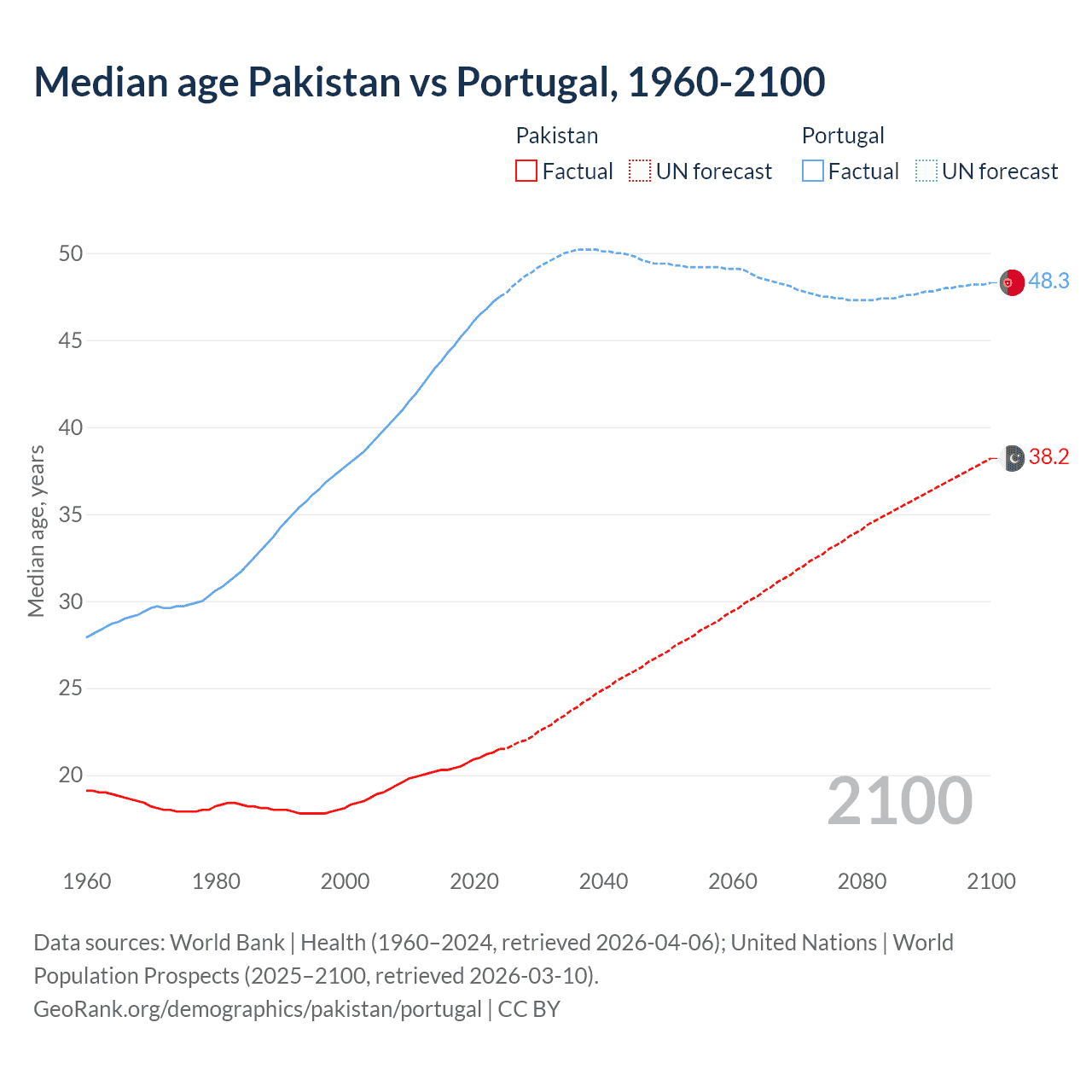 Median age Pakistan vs Portugal, 1960-2100