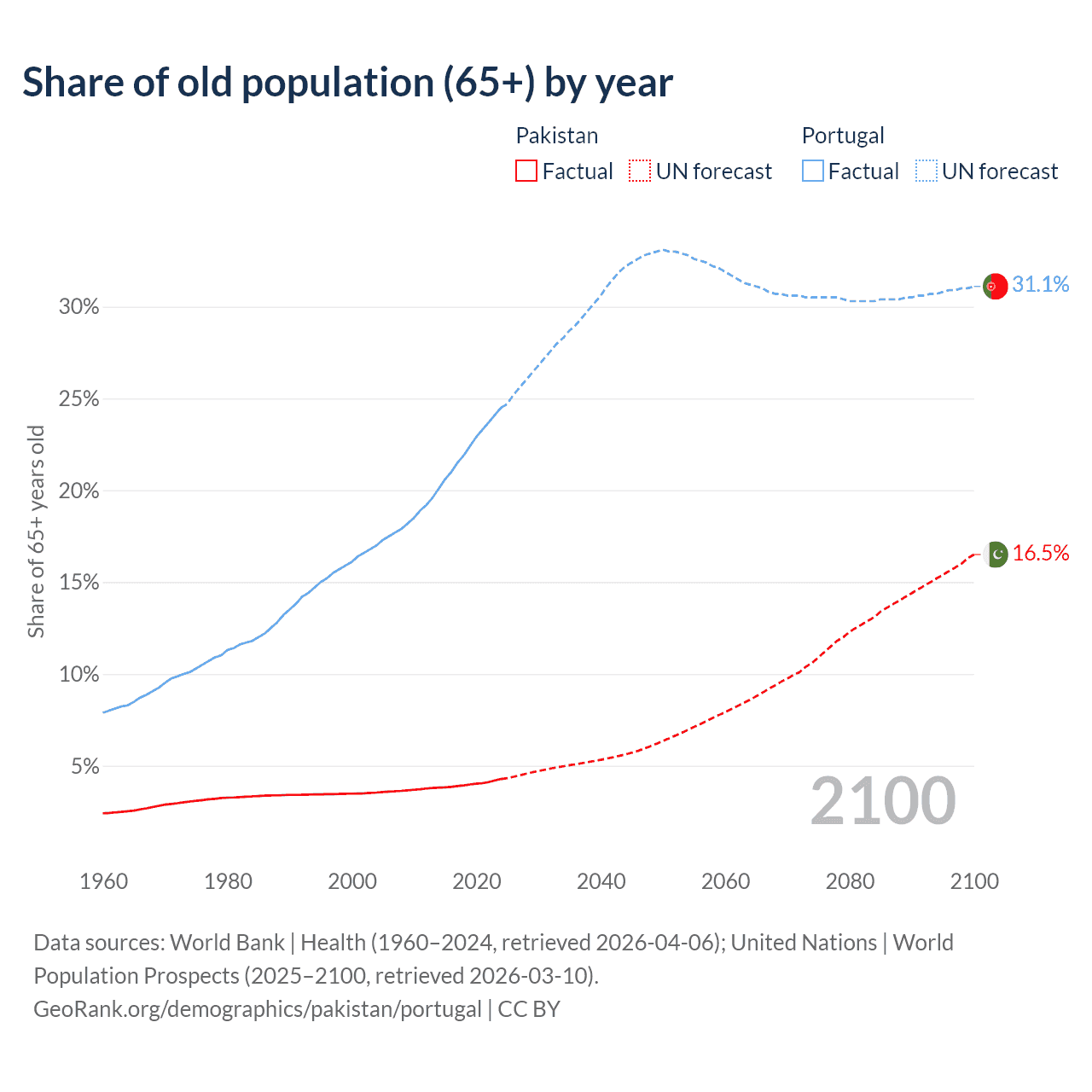 The share of older people aged 65 and over is 4.28% in Pakistan and 24.5% in Portugal. Life expectancy in Pakistan compared to Portugal .
