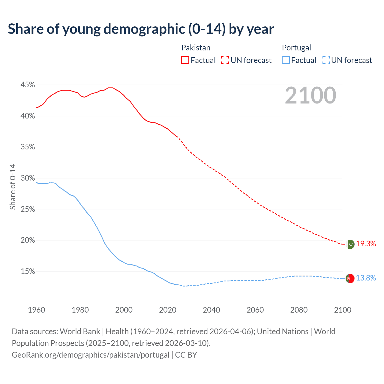- The share of young demographic (0-15 years old) in Pakistan is 36.7% vs 12.8% in Portugal.