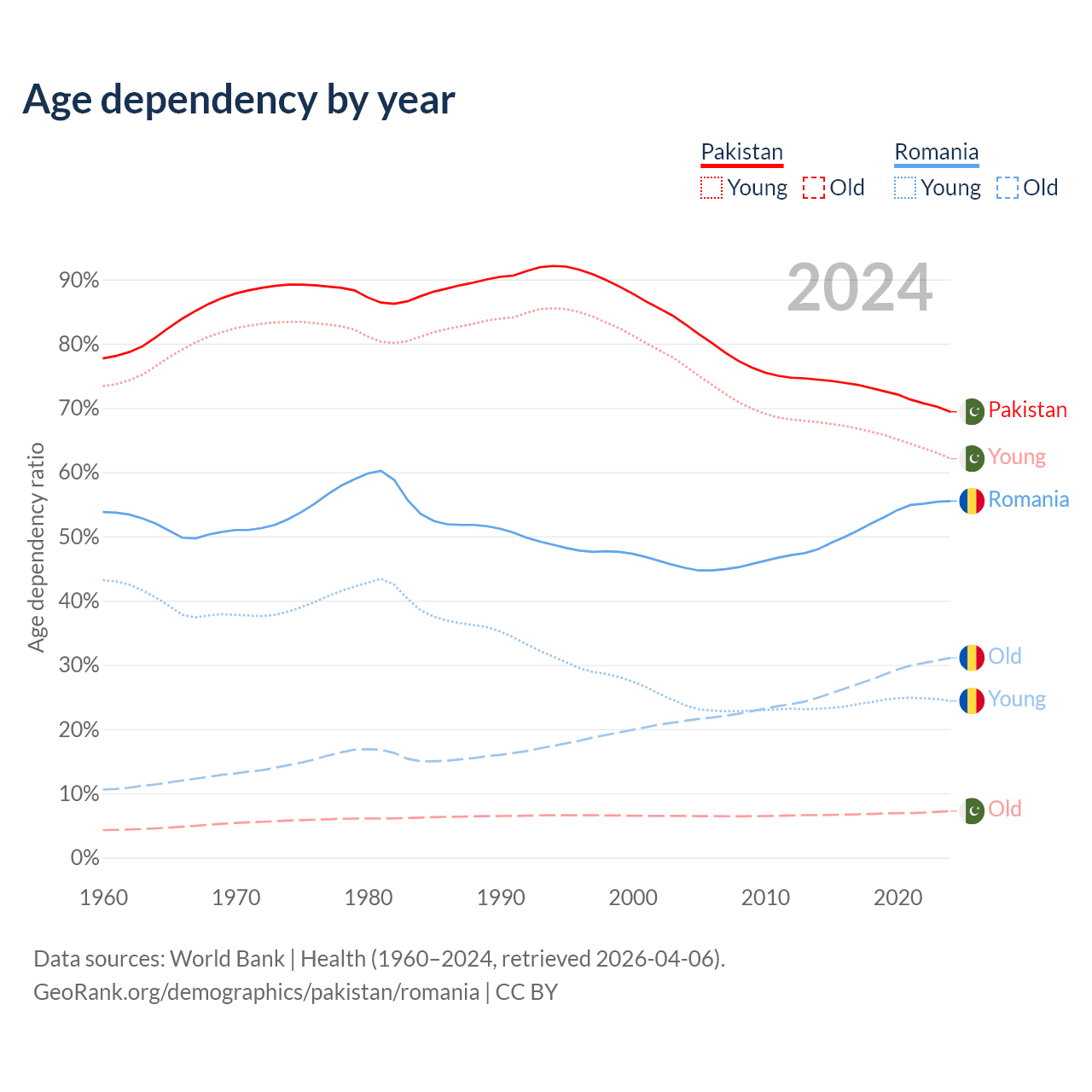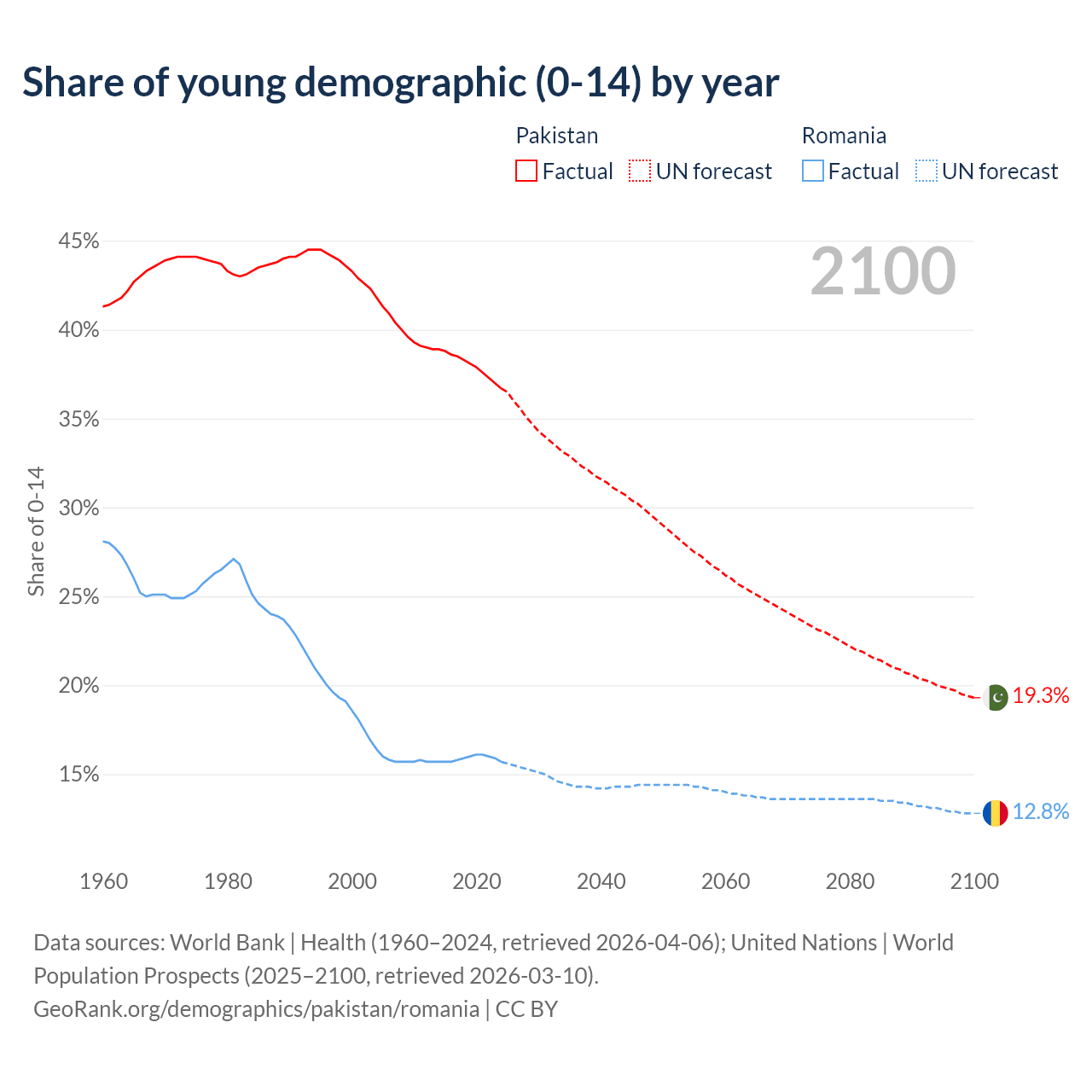 - Pakistan is ranked 154/196 by median age (oldest to youngest) vs 23/196 for Romania.