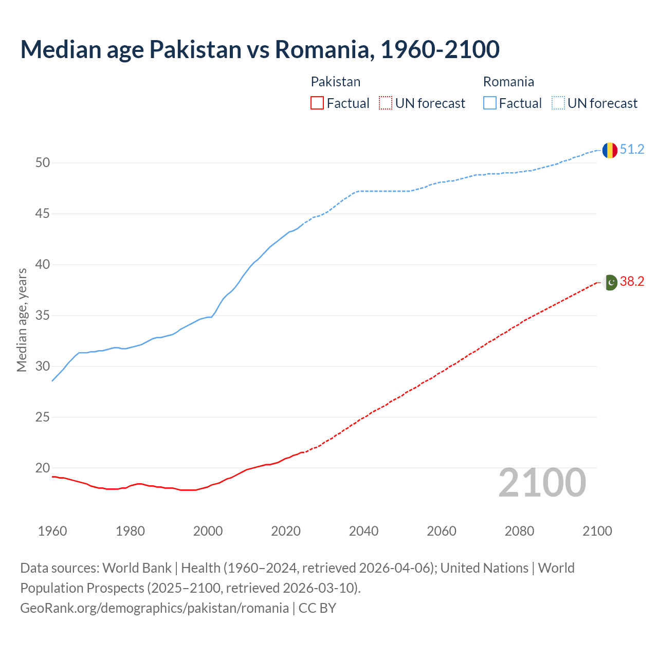 - The median age in Pakistan is 21.5 years compared to 43.8 years in Romania.