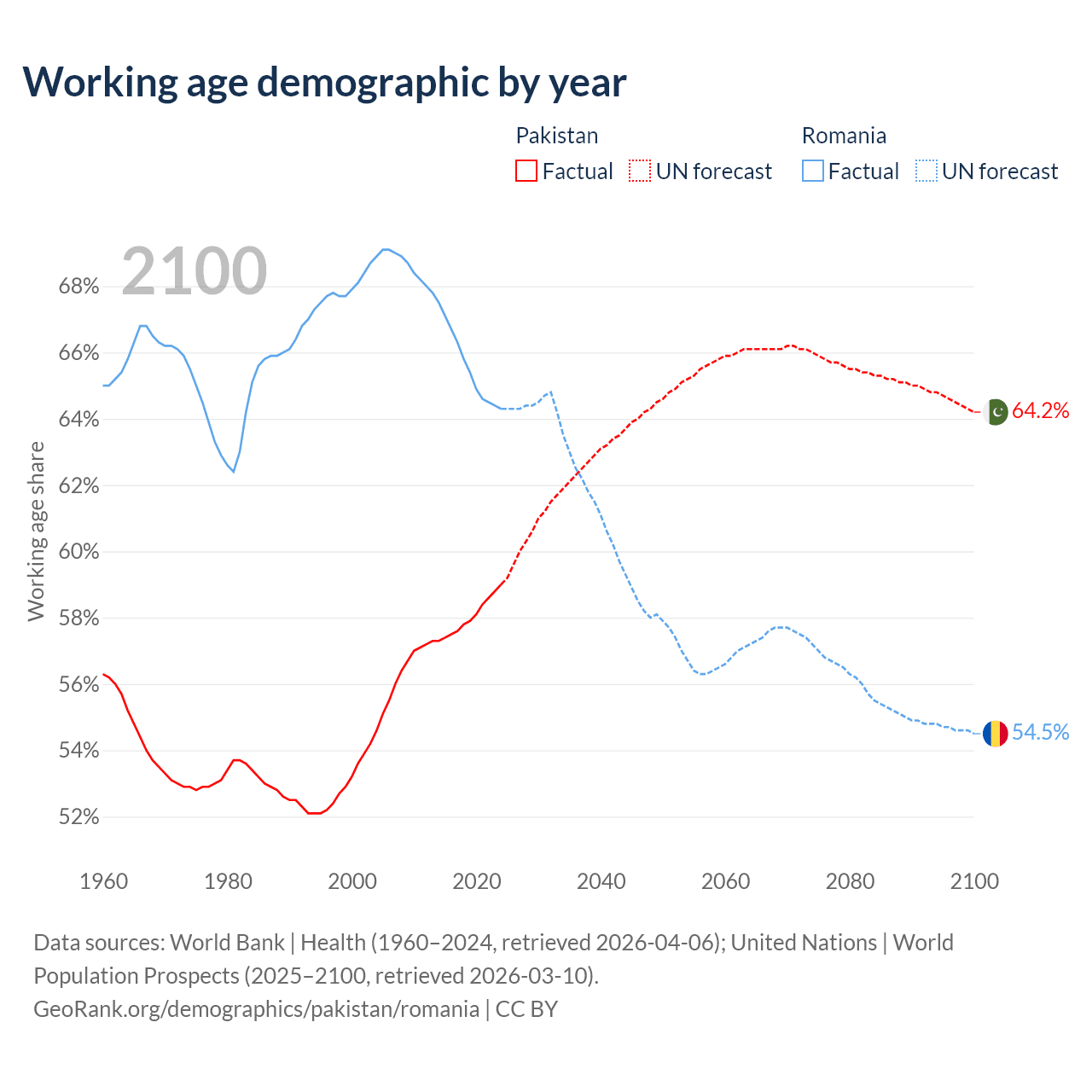 - Pakistan has 154M working age adults (aged 15-64) vs 12.1M in Romania.