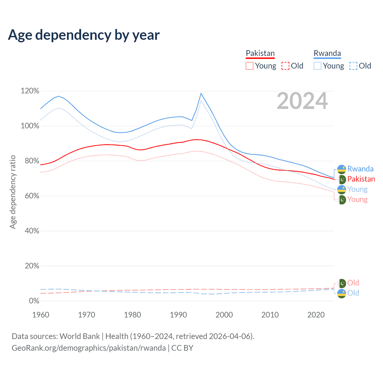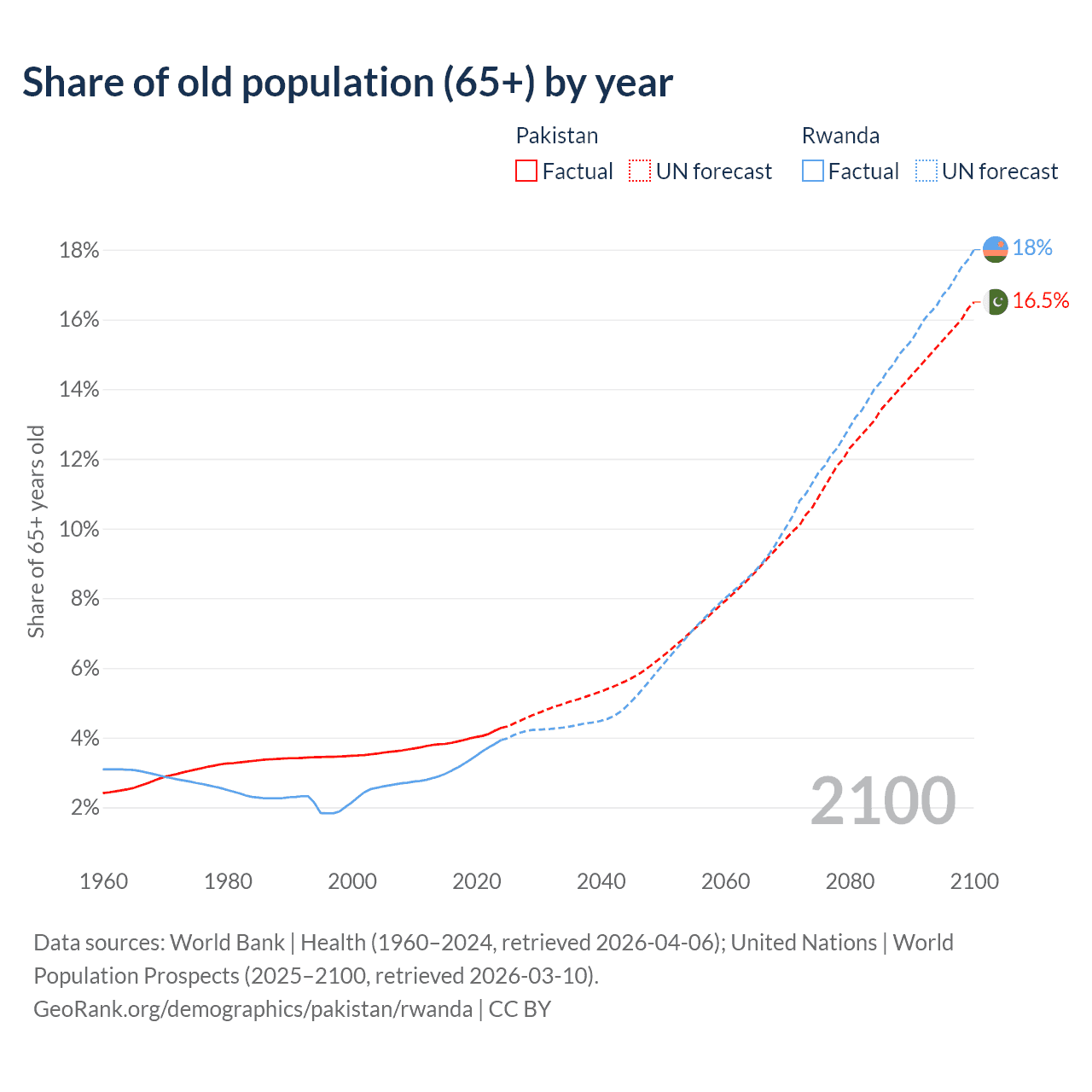 - The share of old-age demographic (65+) in Pakistan is 4.28% vs 3.93% in Rwanda.