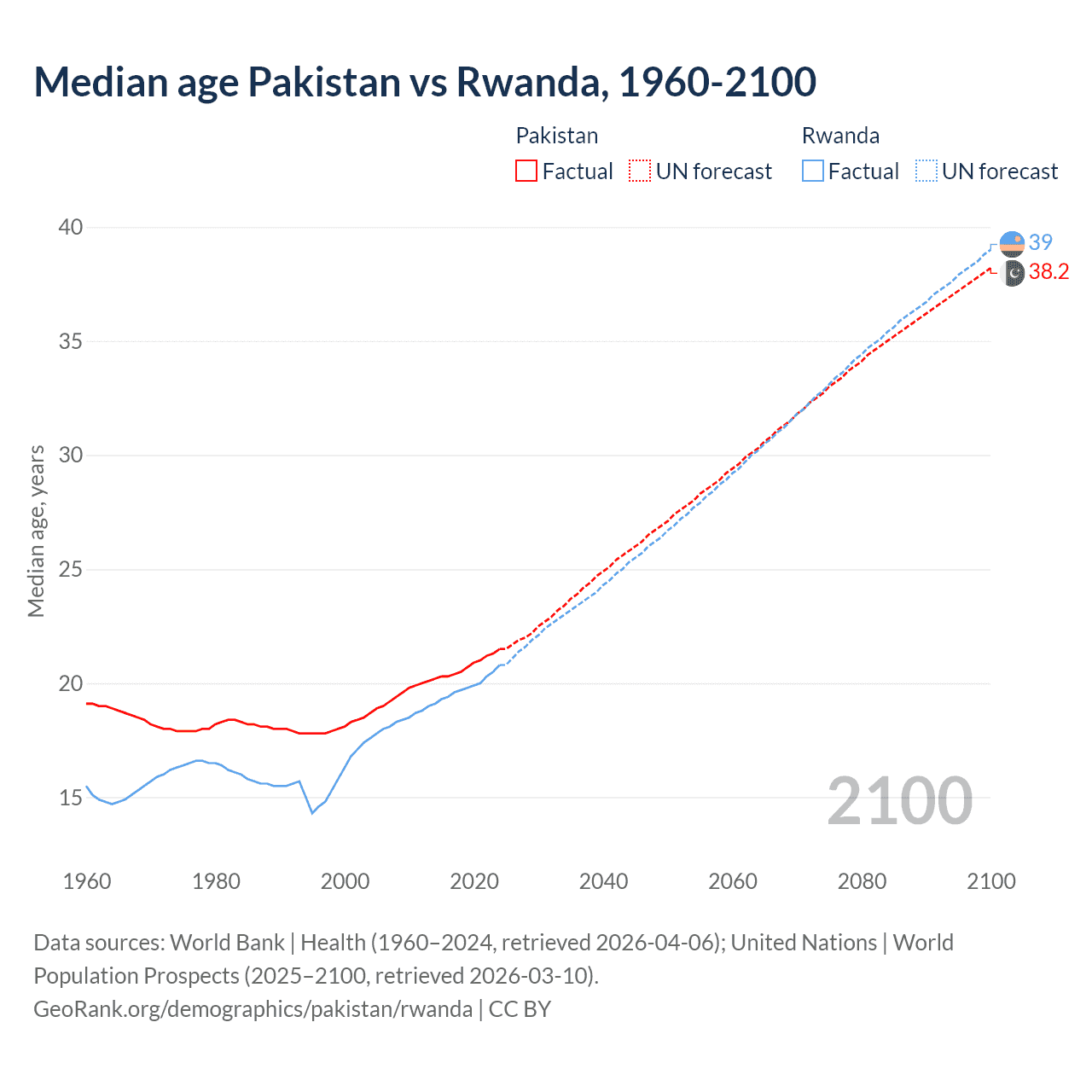 - Pakistan is ranked 154/196 by median age (oldest to youngest) vs 160/196 for Rwanda.