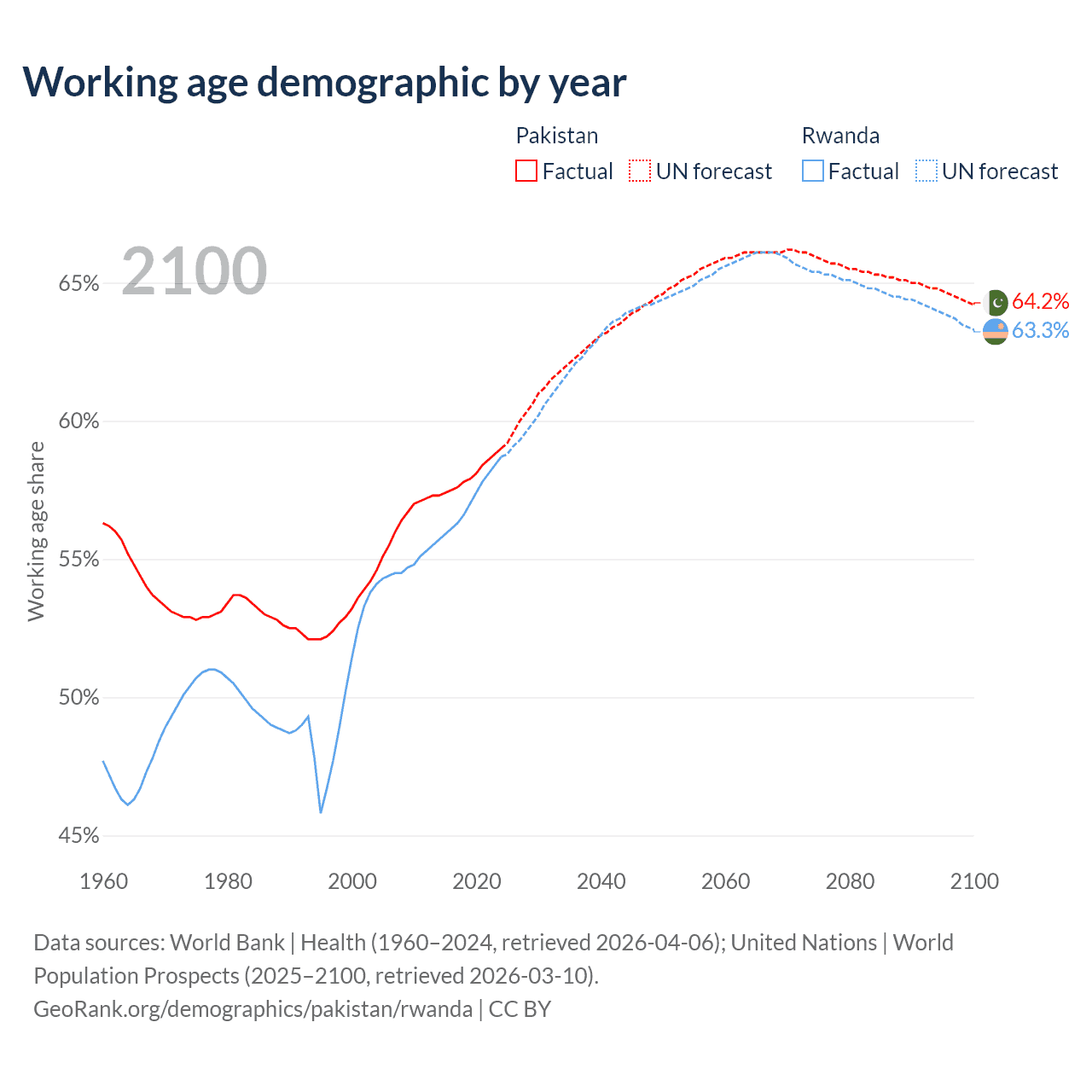 - Pakistan has 154M working age adults (aged 15-64) vs 8.79M in Rwanda.