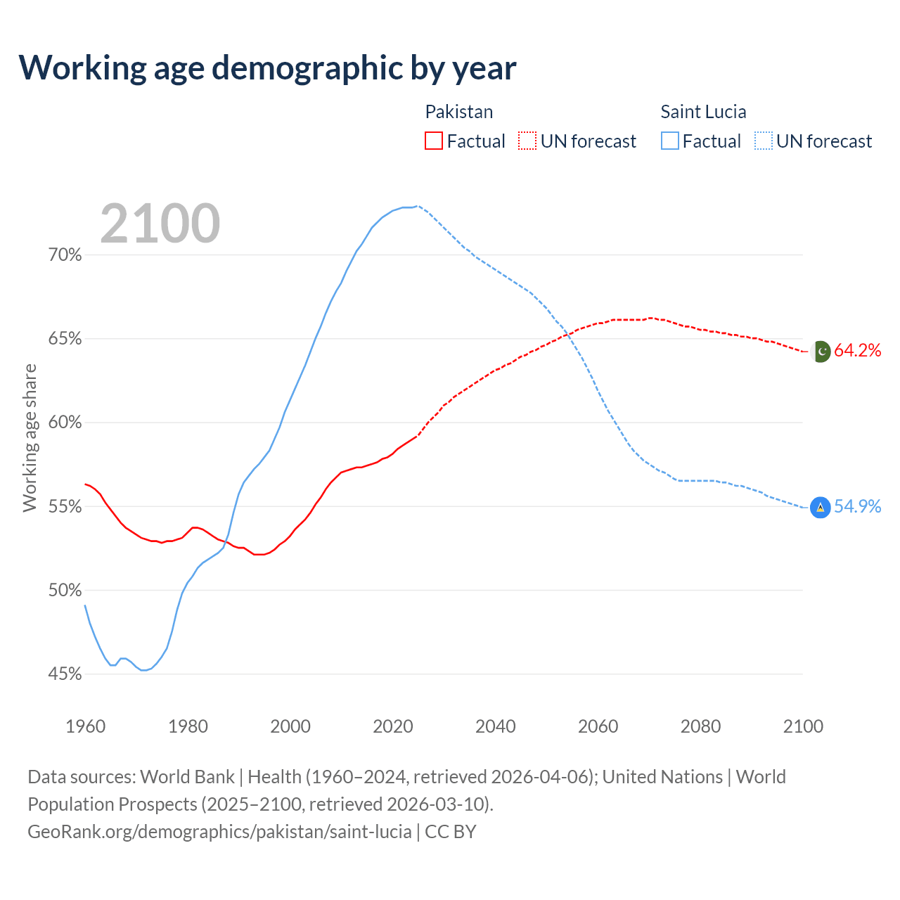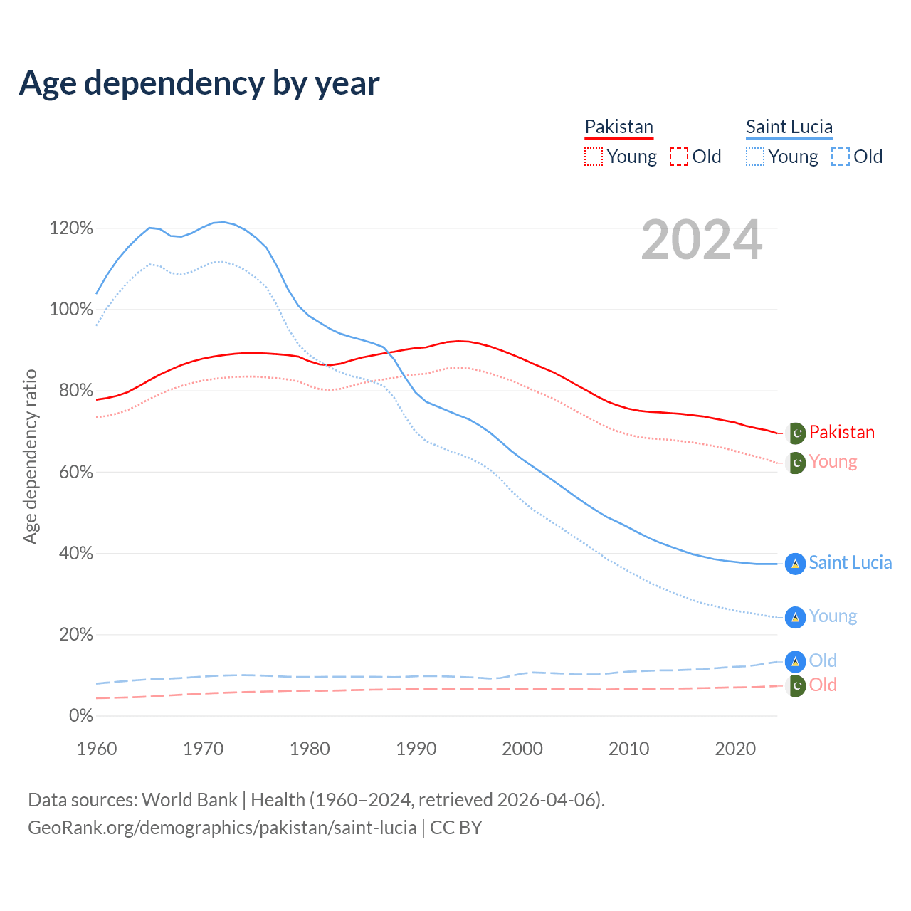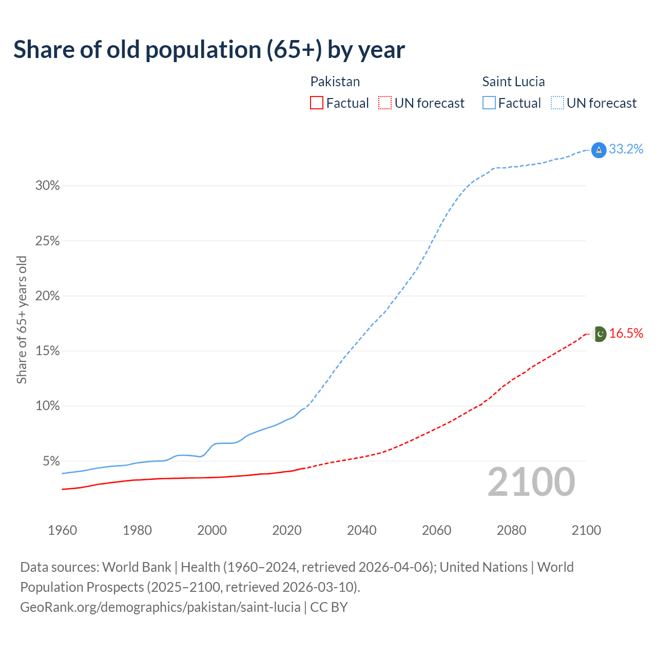 - The share of old-age demographic (65+) in Pakistan is 4.28% vs 9.62% in Saint Lucia.