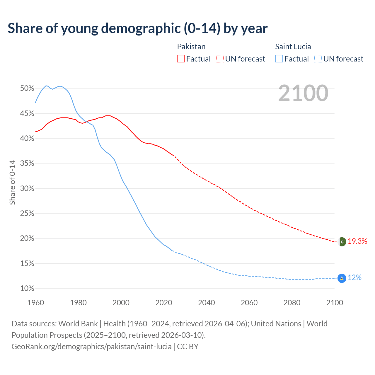 - The share of young demographic (0-15 years old) in Pakistan is 36.7% vs 17.5% in Saint Lucia.
