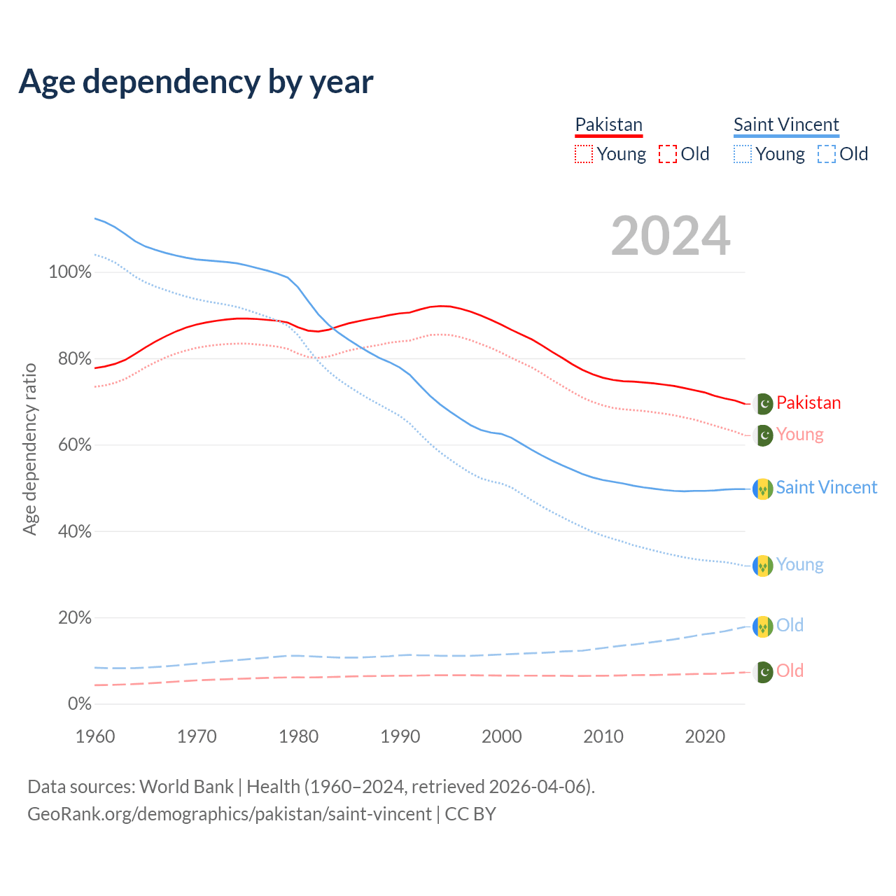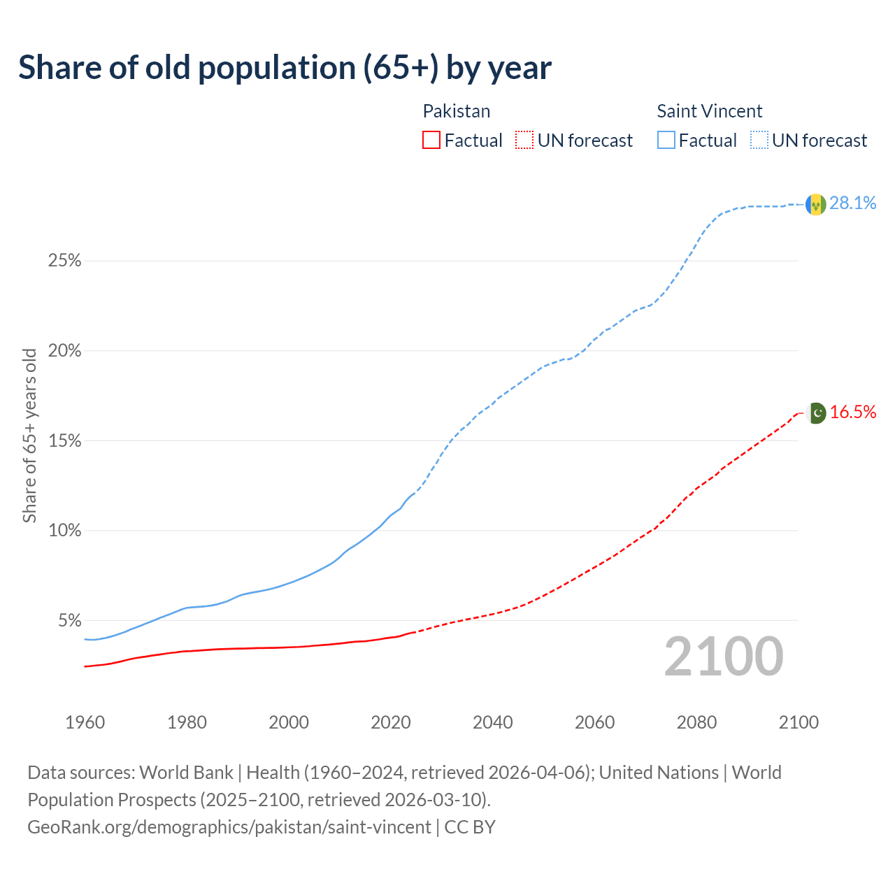 - The share of old-age demographic (65+) in Pakistan is 4.28% vs 11.9% in Saint Vincent.