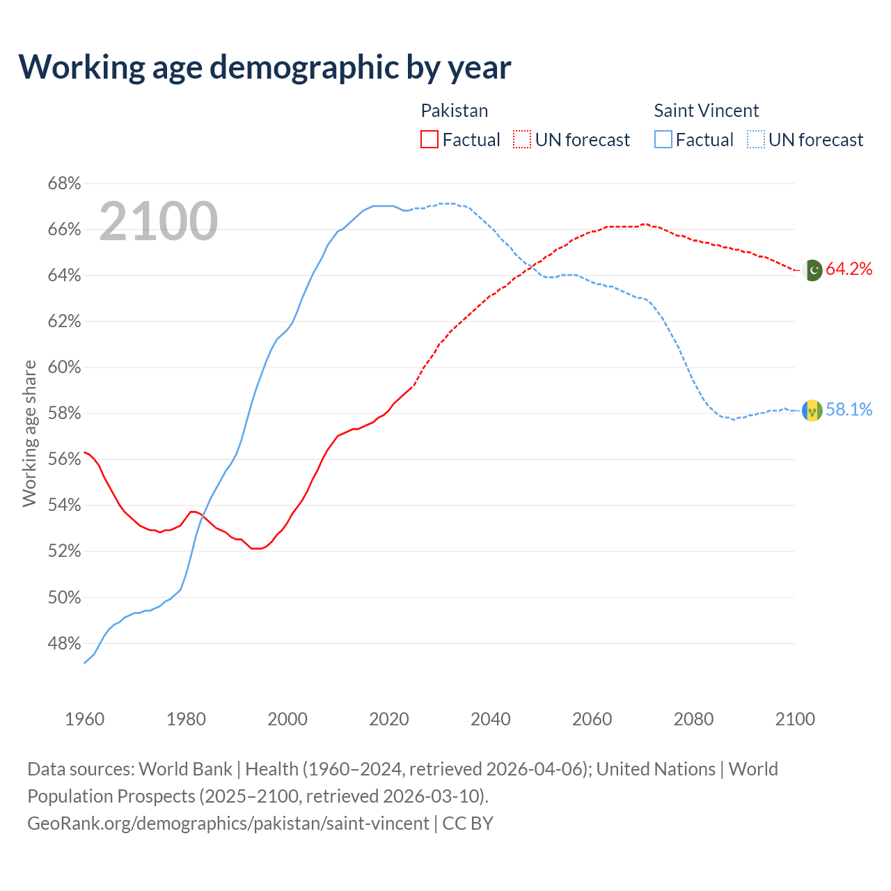 - The share of young demographic (0-15 years old) in Pakistan is 36.7% vs 21.3% in Saint Vincent.