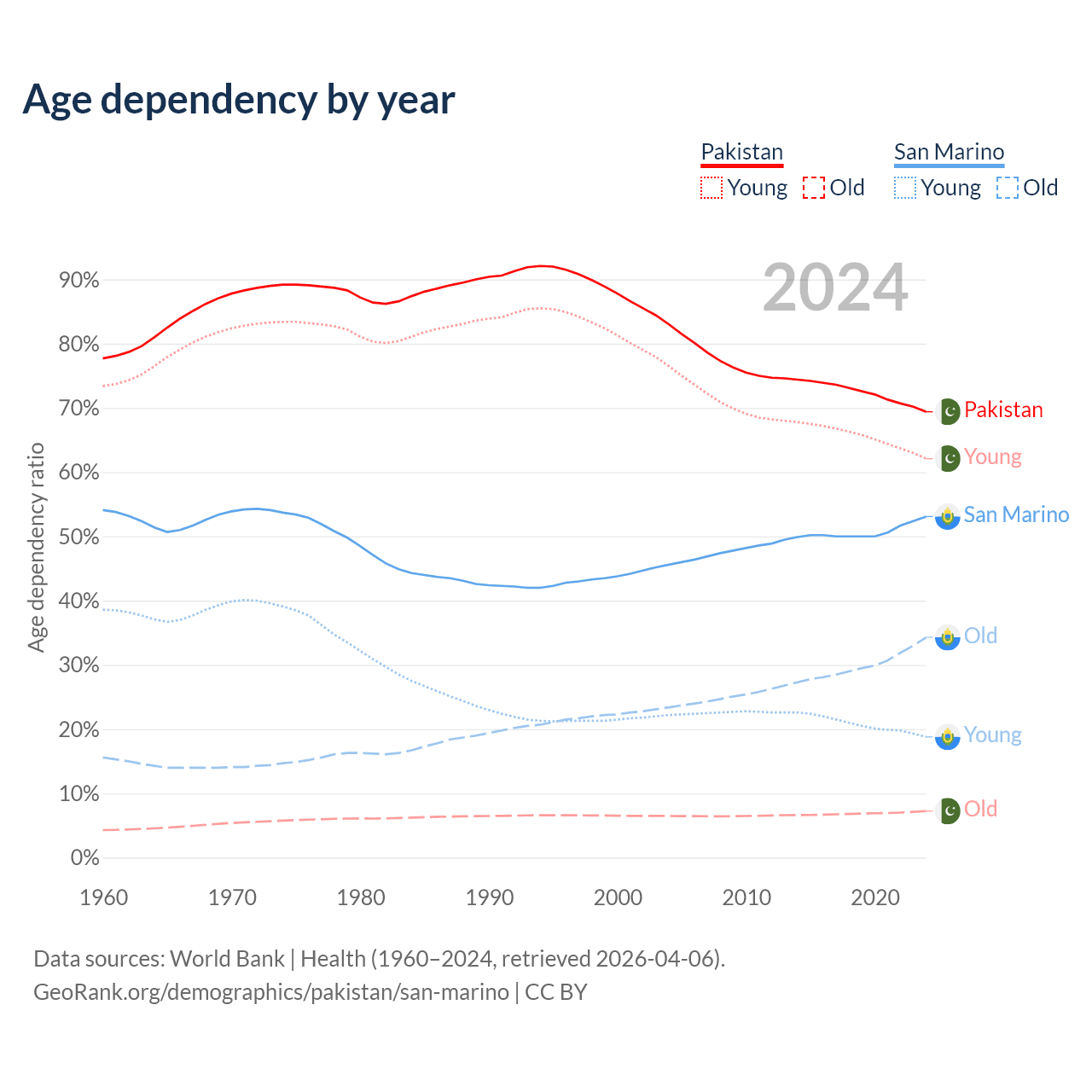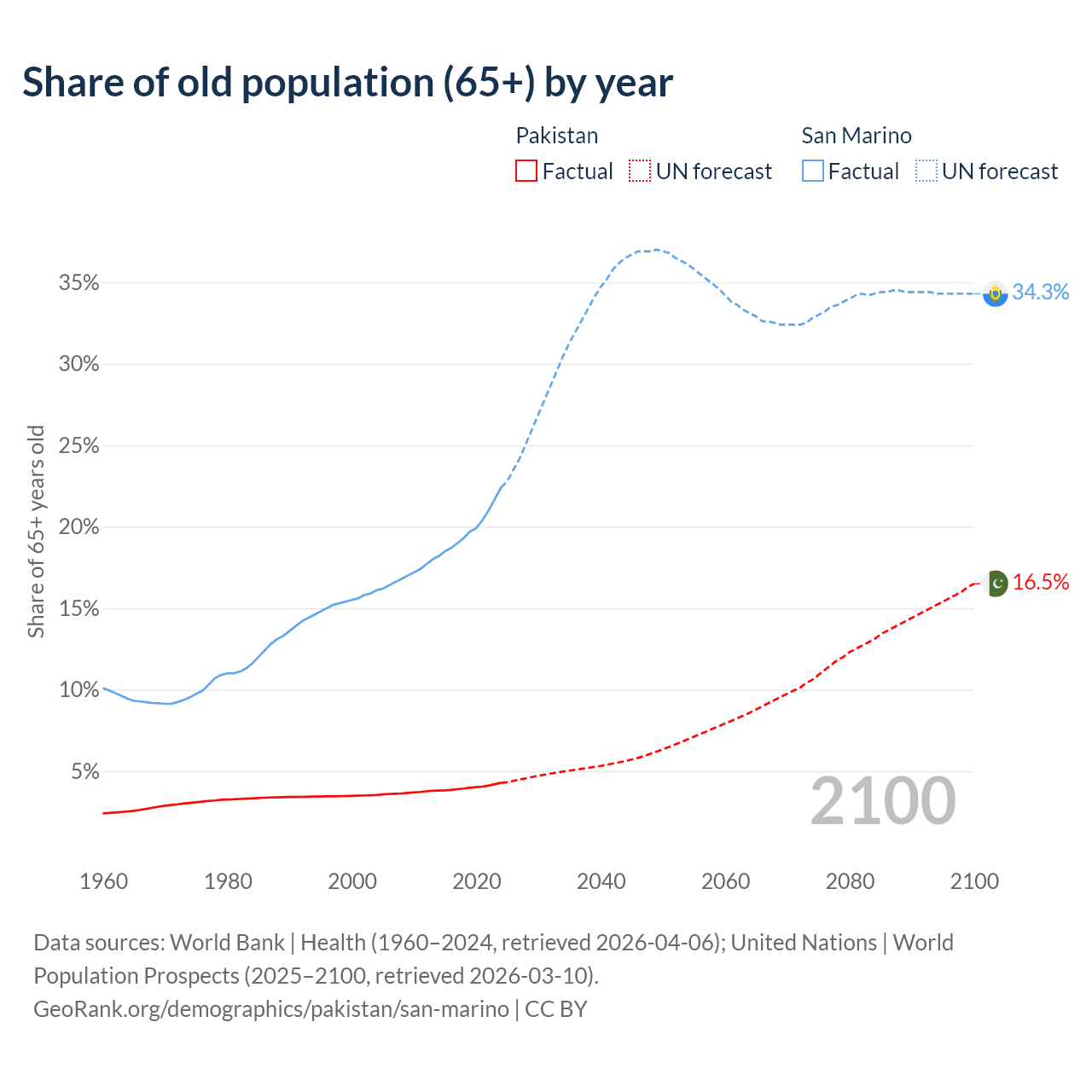 - The share of old-age demographic (65+) in Pakistan is 4.28% vs 22.4% in San Marino.