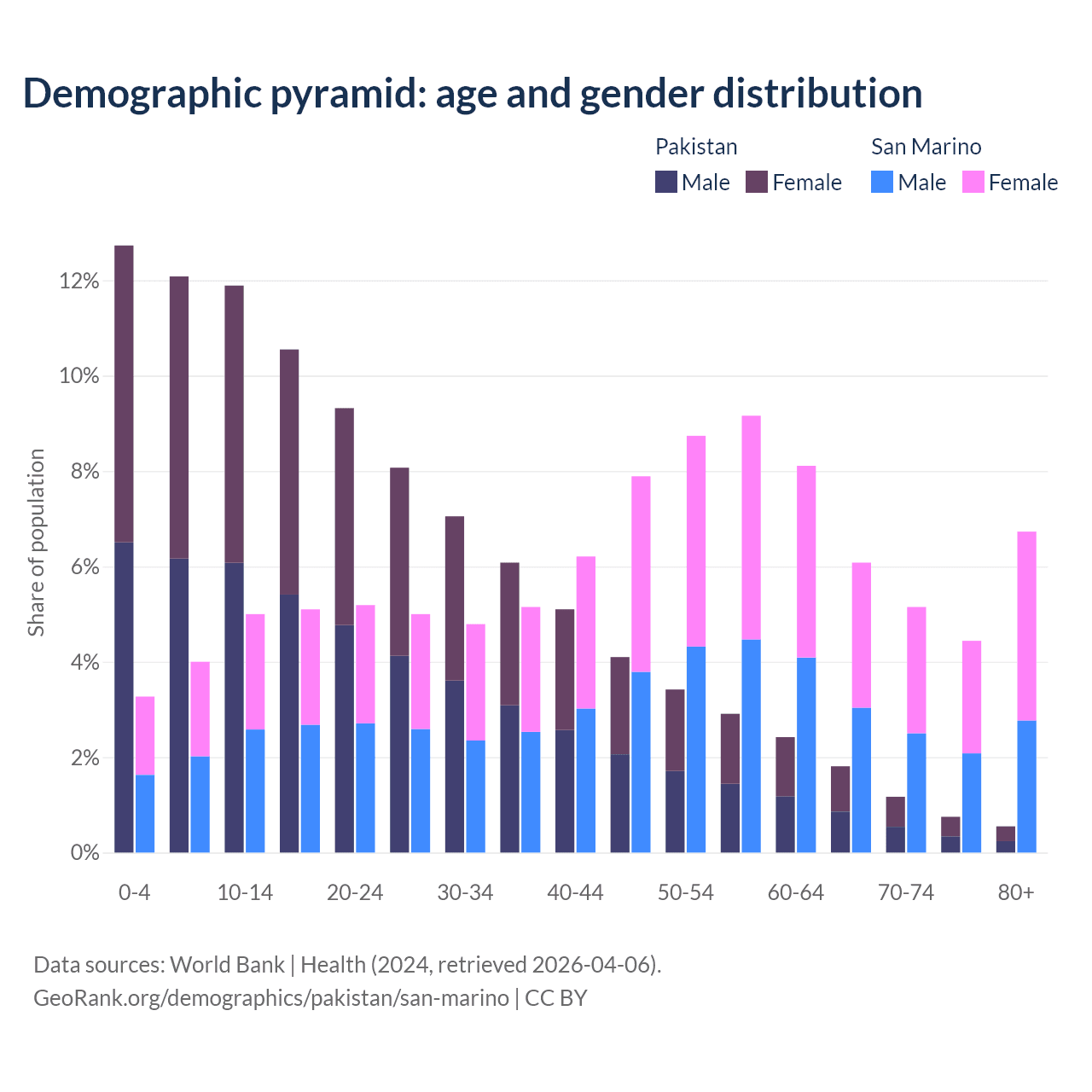 - Pakistan is ranked 154/196 by median age (oldest to youngest) vs 3/196 for San Marino.