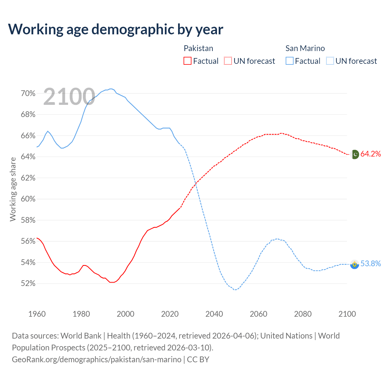 - Pakistan has 154M working age adults (aged 15-64) vs 22.2K in San Marino.