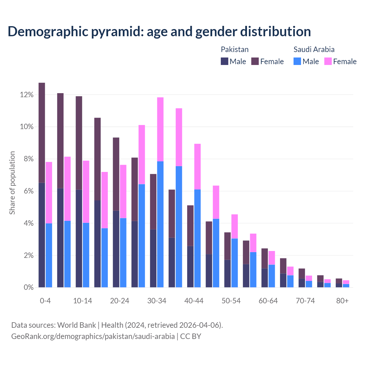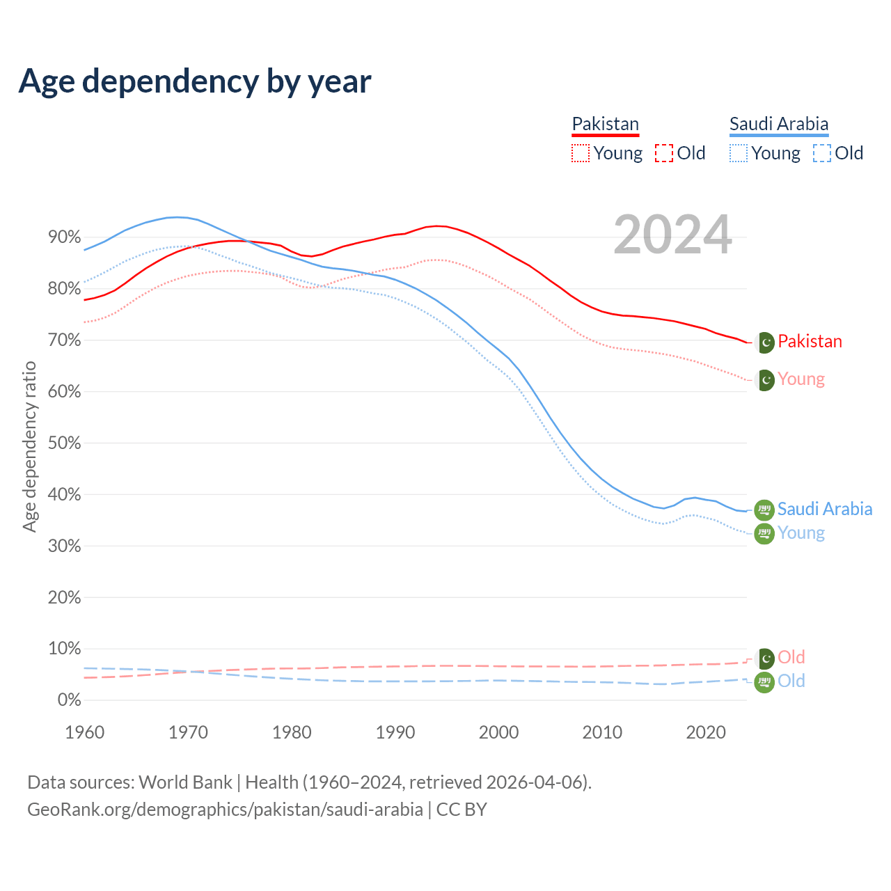 - Pakistan is ranked 154/196 by median age (oldest to youngest) vs 98/196 for Saudi Arabia.