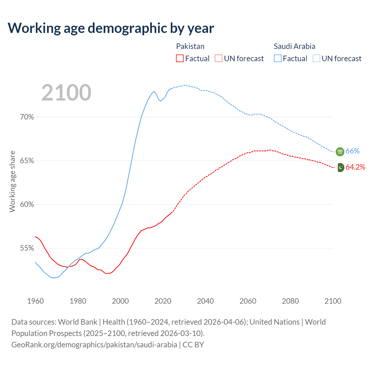 - Pakistan has 154M working age adults (aged 15-64) vs 26.9M in Saudi Arabia.